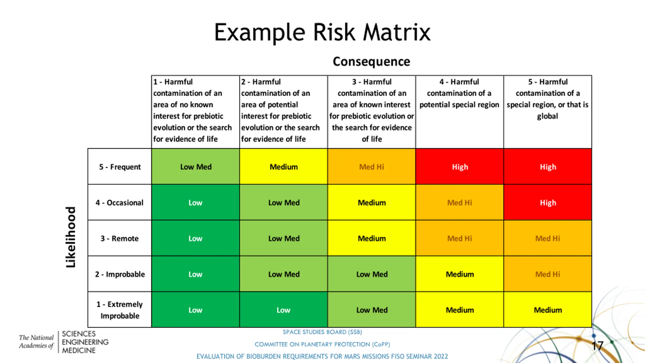 Example Risk Matrix Consequence 1 - Harmful contamination of an area of no known interest for prebiotic evolution or the search for evidence of life 2 - Harmful contamination of an area of potential interest for prebiotic evolution or the search for evidence of life 3 - Harmful contamination of an area of known interest for prebiotic evolution or the search for evidence of life 4 - Harmful contamination of a potential special region 5 - Harmful contamination of a special region, or that is global 5 - Frequent Low Med Medium Med Hi High High 4 - Occasional Low Low Med Medium Med Hi High Likelihood 3 - Remote Low Low Med Medium Med Hi Med Hi 2 - Improbable Low Low Med Low Med Medium Med Hi 1 - Extremely Improbable Low Low Low Med Medium Medium SPACE STUDIES BOARD (SSB) 17 COMMITTEE ON PLANETARY PROTECTION (CoPP) EVALUATION OF BIOBURDEN REQUIREMENTS FOR MARS MISSIONS FISO SEMINAR 2022