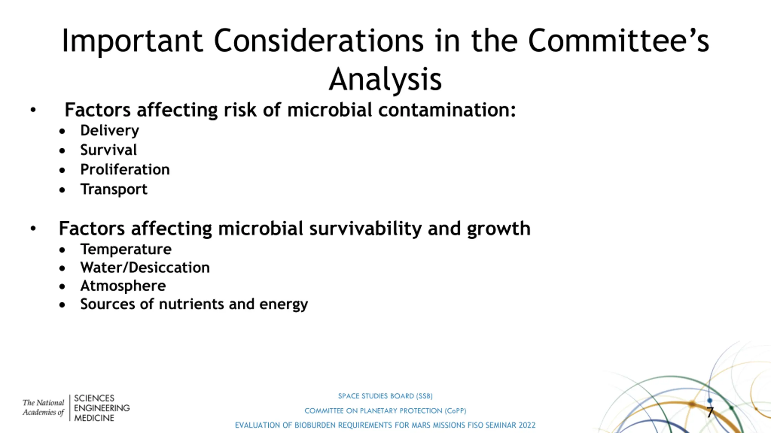 Important Considerations in the Committees Analysis Approaches to planetary protection: Current reduce spacecraft bioburden to below a specified, fixed limit. Alternative tailor mitigation steps in response to assessment of likelihood and consequences of different kinds of risks. NASA vs. non-NASA missions SPACE STUDIES BOARD (SSB) 6 COMMITTEE ON PLANETARY PROTECTION (CoPP) EVALUATION OF BIOBURDEN REQUIREMENTS FOR MARS MISSIONS FISO SEMINAR 2022