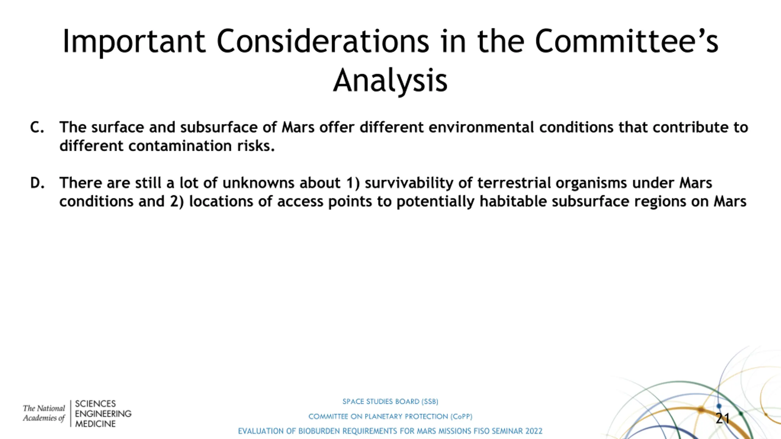 Important Considerations in the Committees Analysis C. The surface and subsurface of Mars offer different environmental conditions that contribute to different contamination risks. D. There are still a lot of unknowns about 1) survivability of terrestrial organisms under Mars conditions and 2) locations of access points to potentially habitable subsurface regions on Mars SPACE STUDIES BOARD (SSB) 21 COMMITTEE ON PLANETARY PROTECTION (CoPP) EVALUATION OF BIOBURDEN REQUIREMENTS FOR MARS MISSIONS FISO SEMINAR 2022