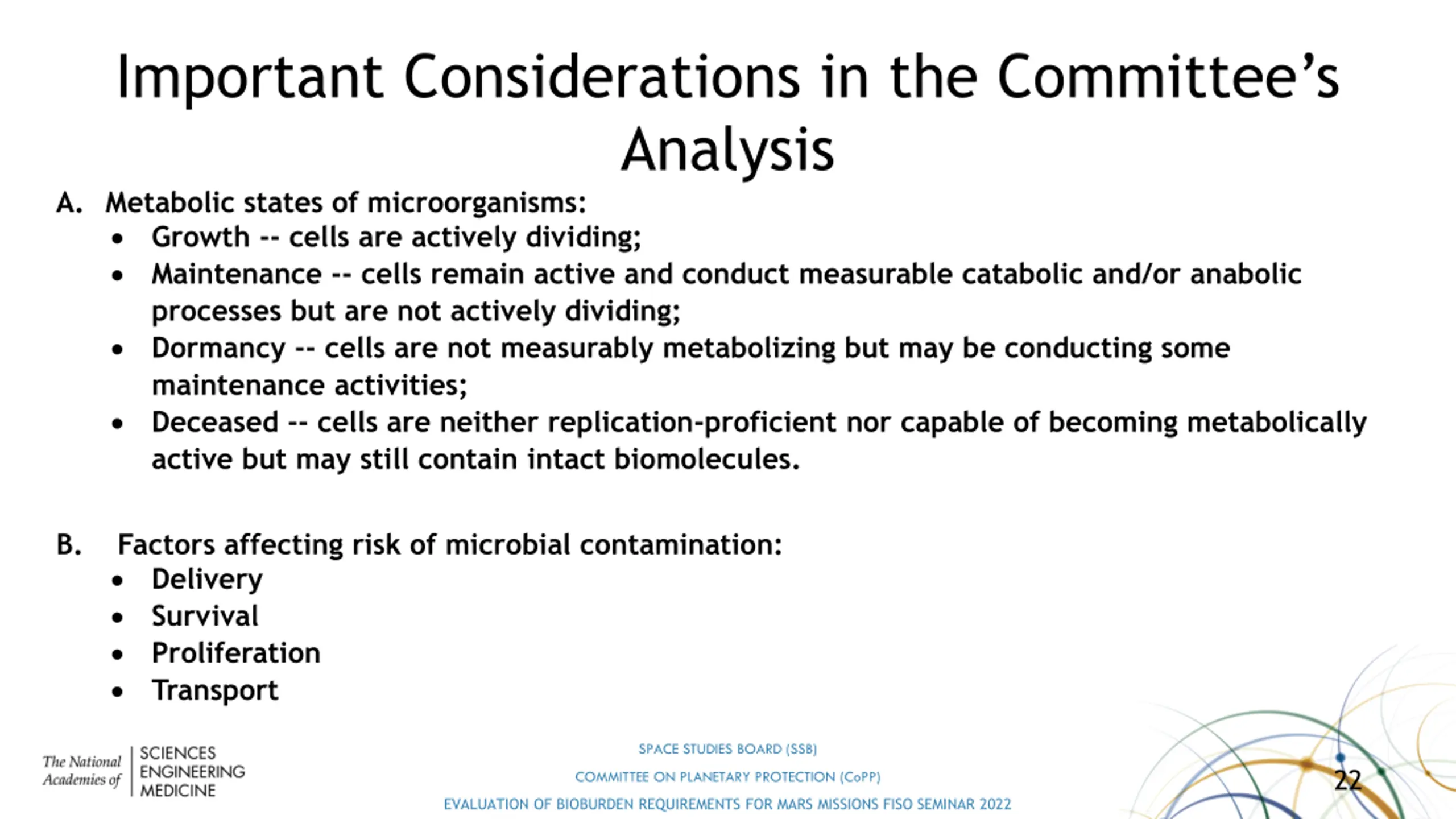 Important Considerations in the Committees Analysis A. Metabolic states of microorganisms: Growth -- cells are actively dividing; Maintenance -- cells remain active and conduct measurable catabolic and/or anabolic processes but are not actively dividing; Dormancy -- cells are not measurably metabolizing but may be conducting some maintenance activities; Deceased -- cells are neither replication-proficient nor capable of becoming metabolically active but may still contain intact biomolecules. B. Factors affecting risk of microbial contamination: Delivery Survival Proliferation Transport SPACE STUDIES BOARD (SSB) 22 COMMITTEE ON PLANETARY PROTECTION (CoPP) EVALUATION OF BIOBURDEN REQUIREMENTS FOR MARS MISSIONS FISO SEMINAR 2022