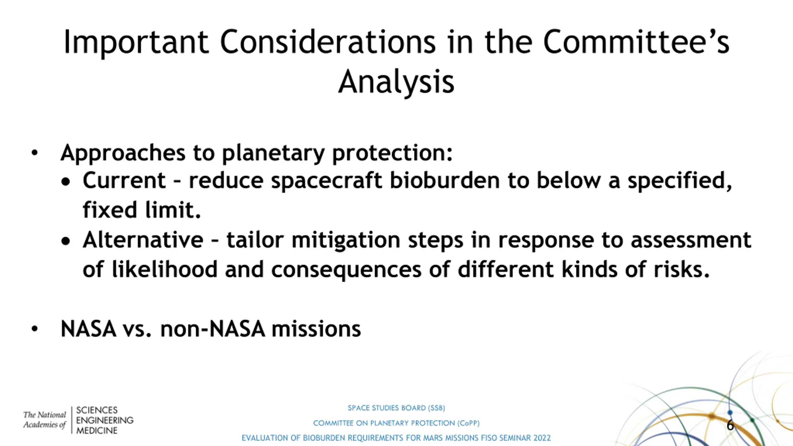 The Committees findings can lead to making portions of Mars more accessible to both commercial and government endeavors by relaxing planetary protection requirements while remaining careful about access to potential habitable zones. SPACE STUDIES BOARD (SSB) 5 COMMITTEE ON PLANETARY PROTECTION (CoPP) EVALUATION OF BIOBURDEN REQUIREMENTS FOR MARS MISSIONS FISO SEMINAR 2022