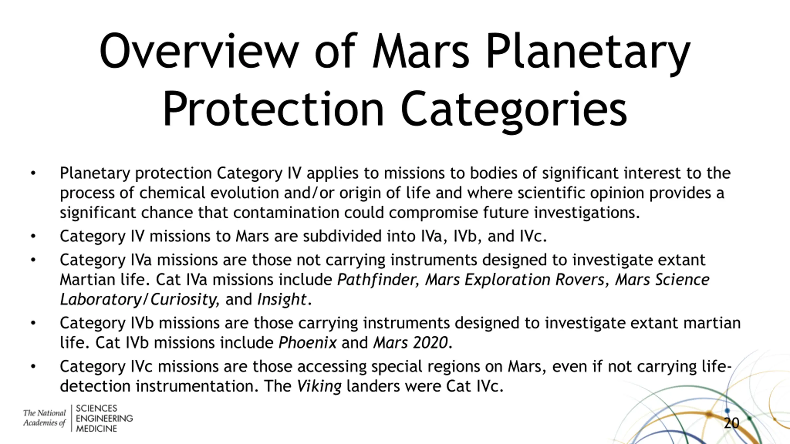 Overview of Mars Planetary Protection Categories Planetary protection Category IV applies to missions to bodies of significant interest to the process of chemical evolution and/or origin of life and where scientific opinion provides a significant chance that contamination could compromise future investigations. Category IV missions to Mars are subdivided into IVa, IVb, and IVc. Category IVa missions are those not carrying instruments designed to investigate extant Martian life. Cat IVa missions include Pathfinder, Mars Exploration Rovers, Mars Science Laboratory/Curiosity, and Insight. Category IVb missions are those carrying instruments designed to investigate extant martian life. Cat IVb missions include Phoenix and Mars 2020. Category IVc missions are those accessing special regions on Mars, even if not carrying life- detection instrumentation. The Viking landers were Cat IVc. 20