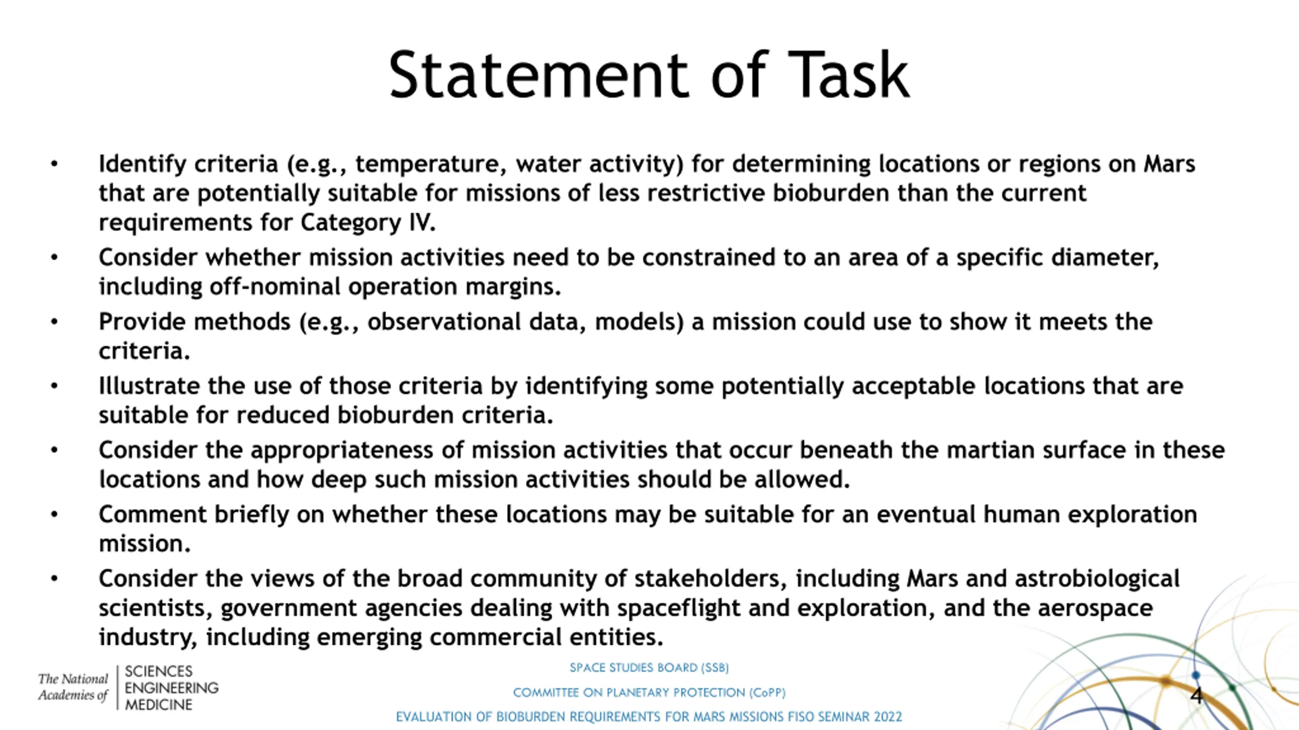 Statement of Task Identify criteria (e.g., temperature, water activity) for determining locations or regions on Mars that are potentially suitable for missions of less restrictive bioburden than the current requirements for Category IV. Consider whether mission activities need to be constrained to an area of a specific diameter, including off-nominal operation margins. Provide methods (e.g., observational data, models) a mission could use to show it meets the criteria. Illustrate the use of those criteria by identifying some potentially acceptable locations that are suitable for reduced bioburden criteria. Consider the appropriateness of mission activities that occur beneath the martian surface in these locations and how deep such mission activities should be allowed. Comment briefly on whether these locations may be suitable for an eventual human exploration mission. Consider the views of the broad community of stakeholders, including Mars and astrobiological scientists, government agencies dealing with spaceflight and exploration, and the aerospace industry, including emerging commercial entities. SPACE STUDIES BOARD (SSB) 4 COMMITTEE ON PLANETARY PROTECTION (CoPP) EVALUATION OF BIOBURDEN REQUIREMENTS FOR MARS MISSIONS FISO SEMINAR 2022