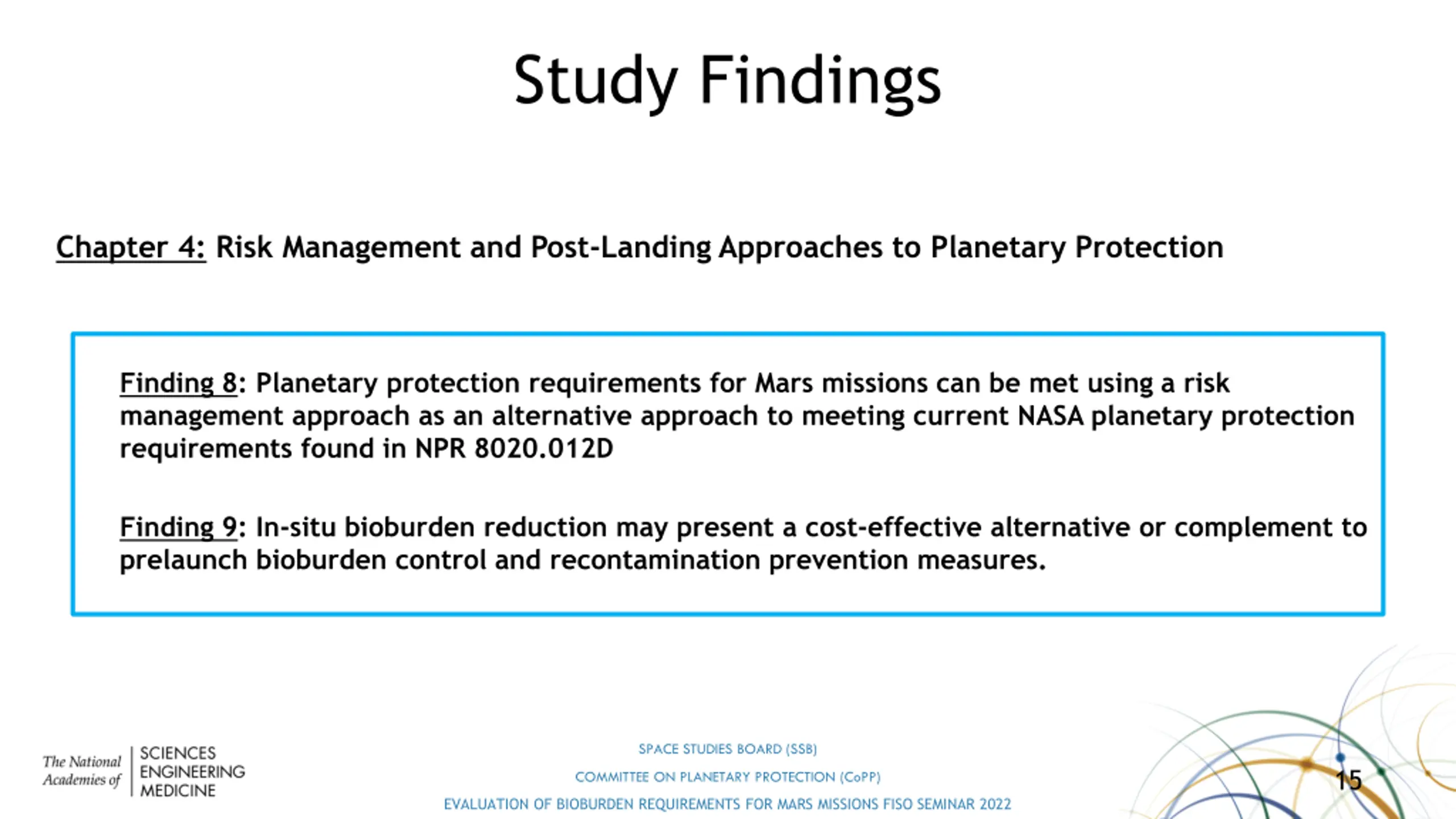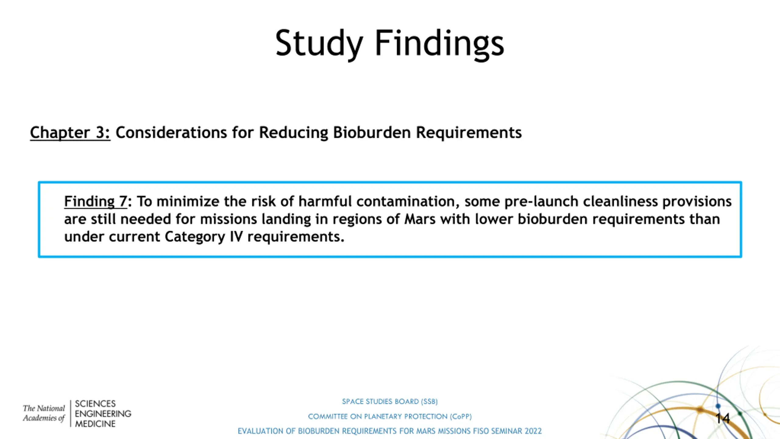 Study Findings Chapter 3: Considerations for Reducing Bioburden Requirements Finding 7: To minimize the risk of harmful contamination, some pre-launch cleanliness provisions are still needed for missions landing in regions of Mars with lower bioburden requirements than under current Category IV requirements. SPACE STUDIES BOARD (SSB) 14 COMMITTEE ON PLANETARY PROTECTION (CoPP) EVALUATION OF BIOBURDEN REQUIREMENTS FOR MARS MISSIONS FISO SEMINAR 2022