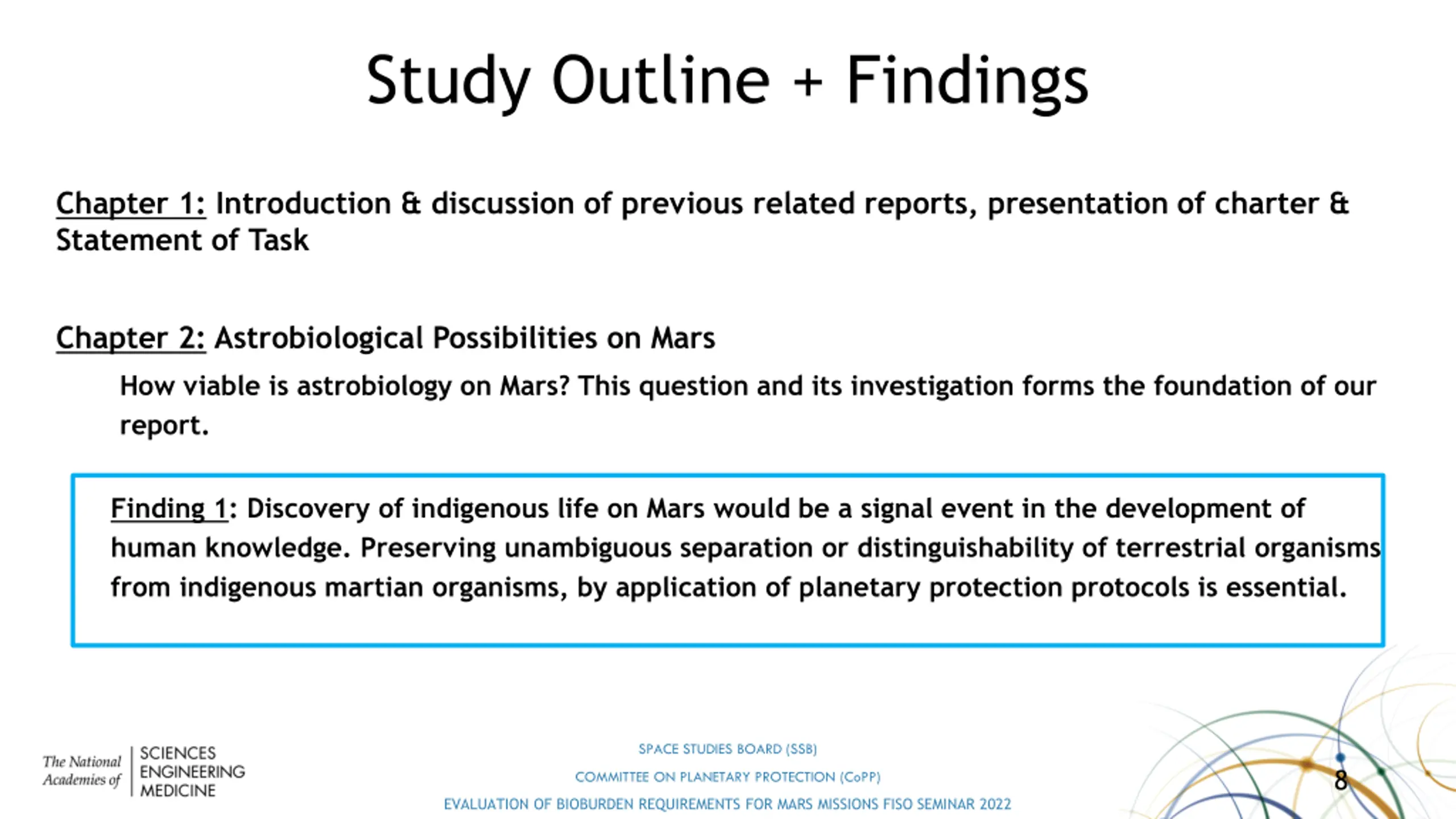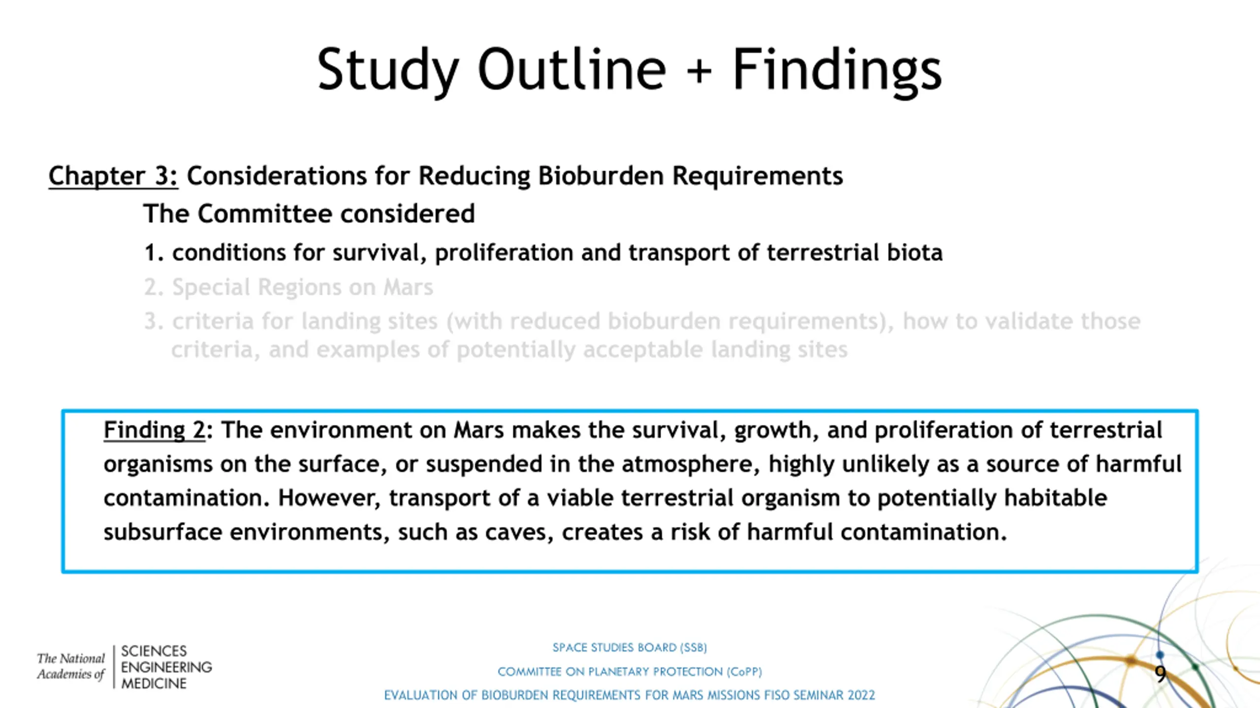 Study Outline + Findings Chapter 1: Introduction & discussion of previous related reports, presentation of charter & Statement of Task Chapter 2: Astrobiological Possibilities on Mars How viable is astrobiology on Mars? This question and its investigation forms the foundation of our report. Finding 1: Discovery of indigenous life on Mars would be a signal event in the development of human knowledge. Preserving unambiguous separation or distinguishability of terrestrial organisms from indigenous martian organisms, by application of planetary protection protocols is essential. SPACE STUDIES BOARD (SSB) 8 COMMITTEE ON PLANETARY PROTECTION (CoPP) EVALUATION OF BIOBURDEN REQUIREMENTS FOR MARS MISSIONS FISO SEMINAR 2022