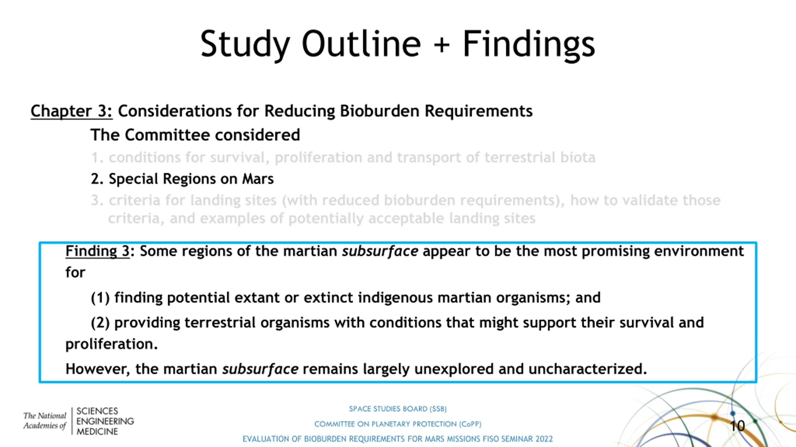 Study Outline + Findings Chapter 3: Considerations for Reducing Bioburden Requirements The Committee considered 1. conditions for survival, proliferation and transport of terrestrial biota 2. Special Regions on Mars 3. criteria for landing sites (with reduced bioburden requirements), how to validate those criteria, and examples of potentially acceptable landing sites Finding 2: The environment on Mars makes the survival, growth, and proliferation of terrestrial organisms on the surface, or suspended in the atmosphere, highly unlikely as a source of harmful contamination. However, transport of a viable terrestrial organism to potentially habitable subsurface environments, such as caves, creates a risk of harmful contamination. SPACE STUDIES BOARD (SSB) 9 COMMITTEE ON PLANETARY PROTECTION (CoPP) EVALUATION OF BIOBURDEN REQUIREMENTS FOR MARS MISSIONS FISO SEMINAR 2022