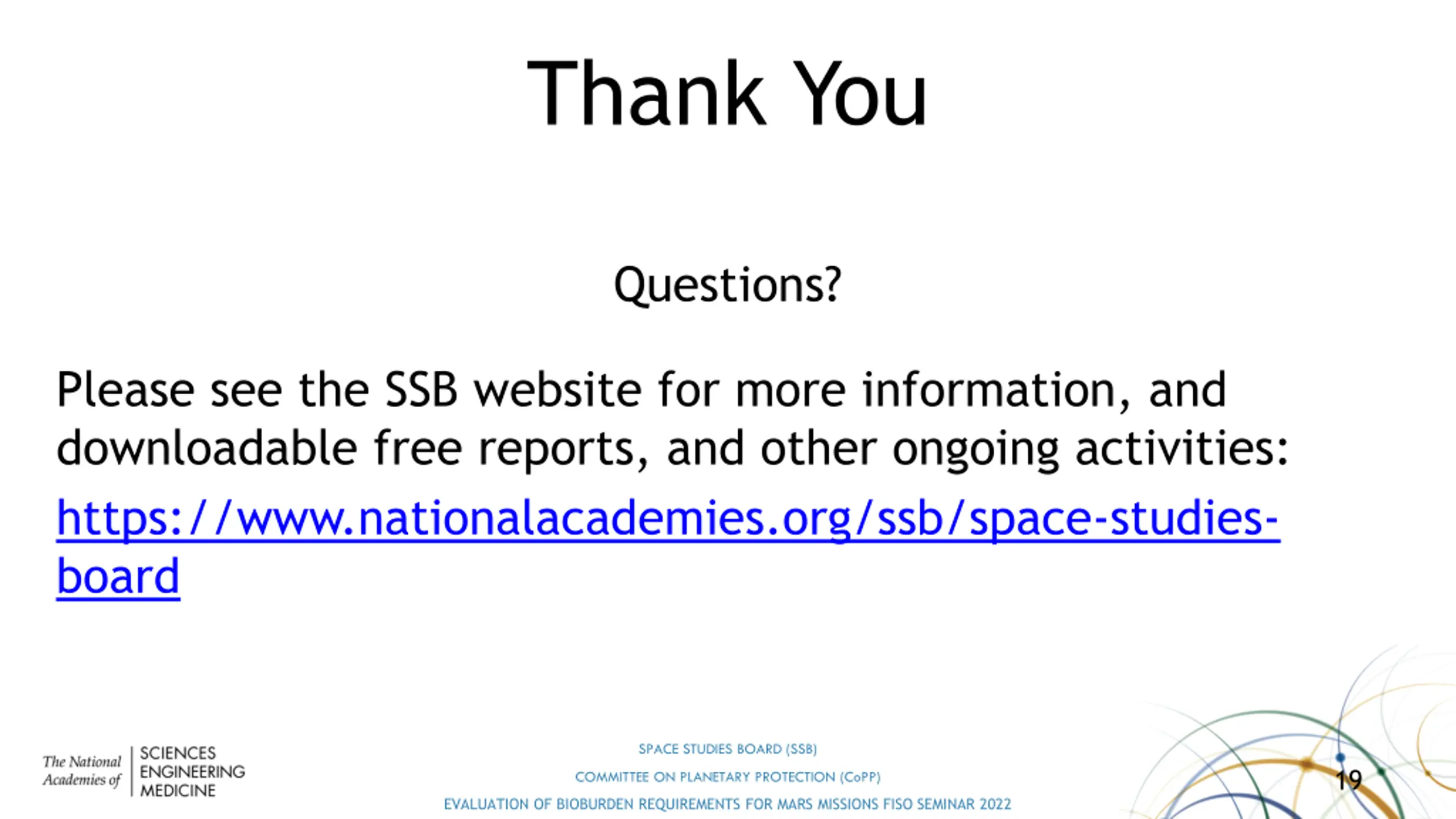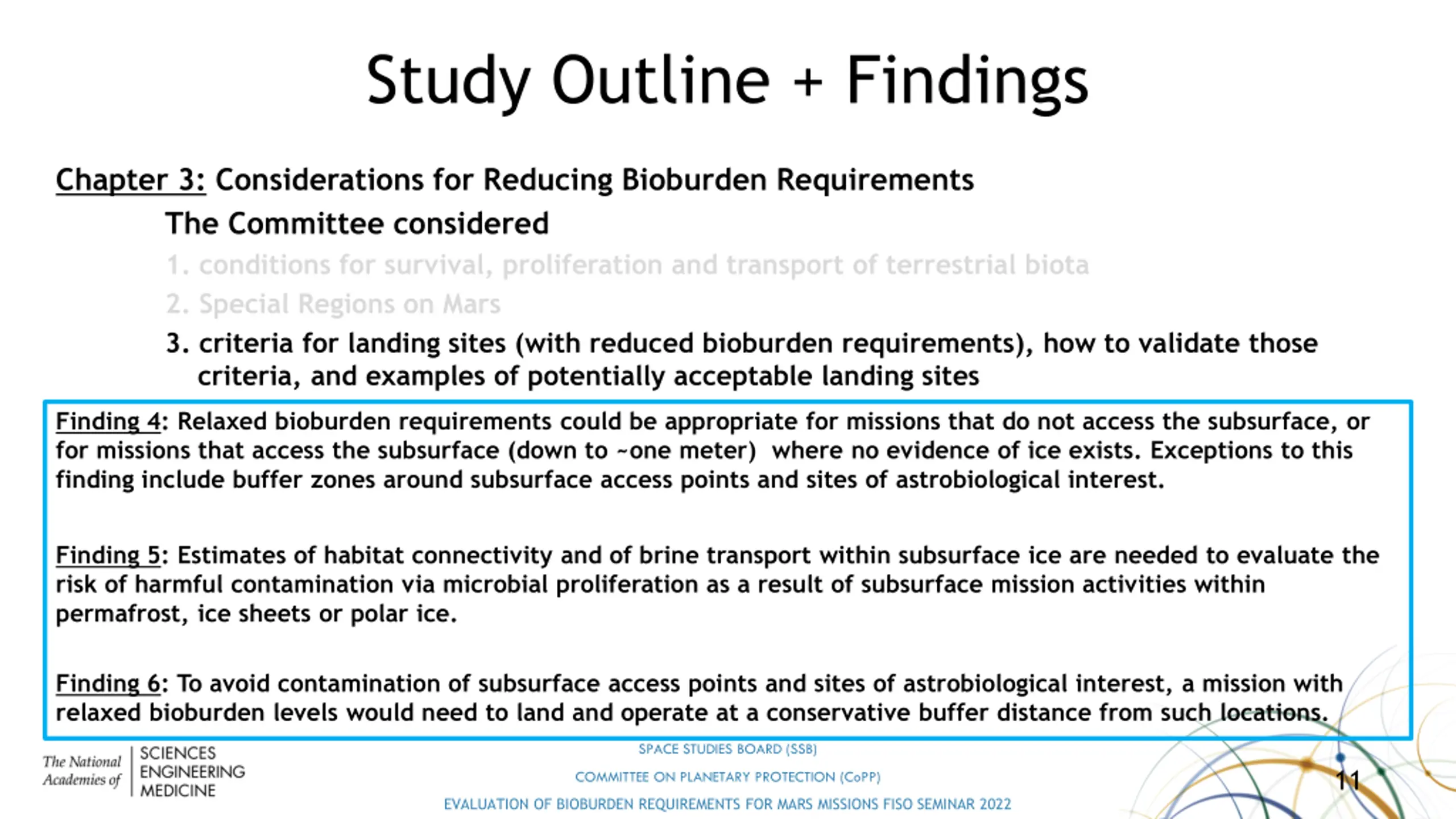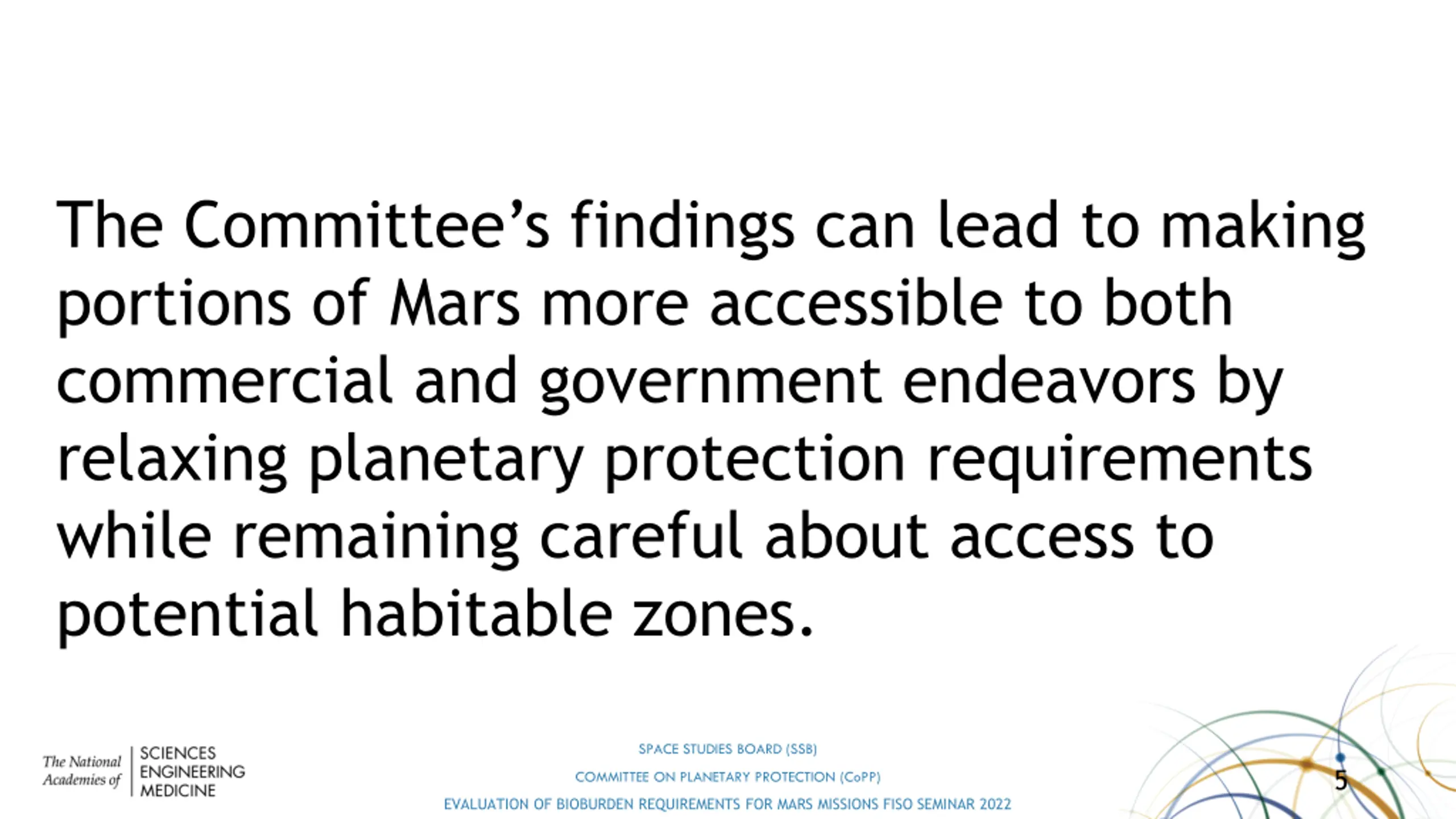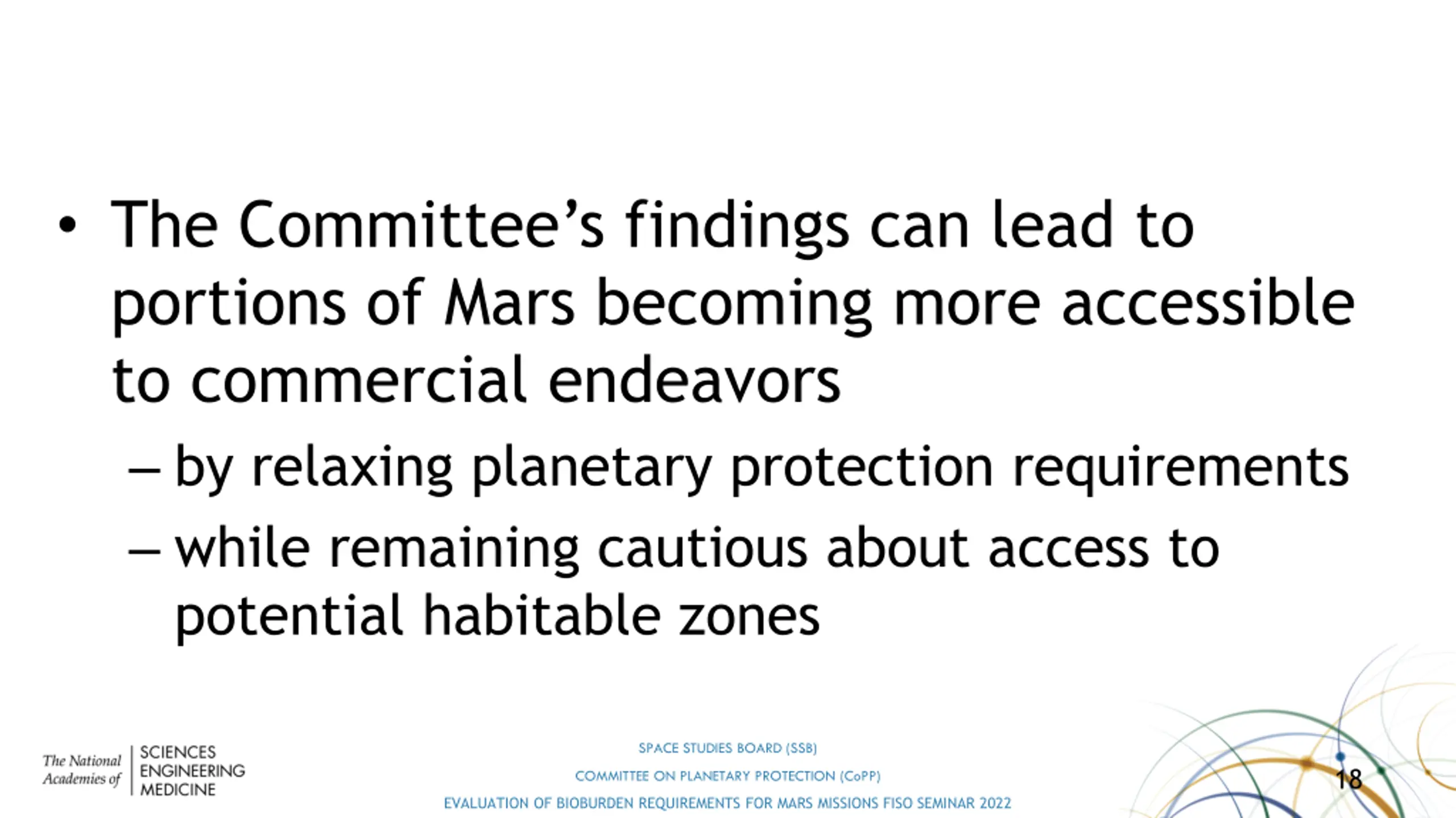 The Committees findings can lead to portions of Mars becoming more accessible to commercial endeavors by relaxing planetary protection requirements while remaining cautious about access to potential habitable zones SPACE STUDIES BOARD (SSB) 18 COMMITTEE ON PLANETARY PROTECTION (CoPP) EVALUATION OF BIOBURDEN REQUIREMENTS FOR MARS MISSIONS FISO SEMINAR 2022