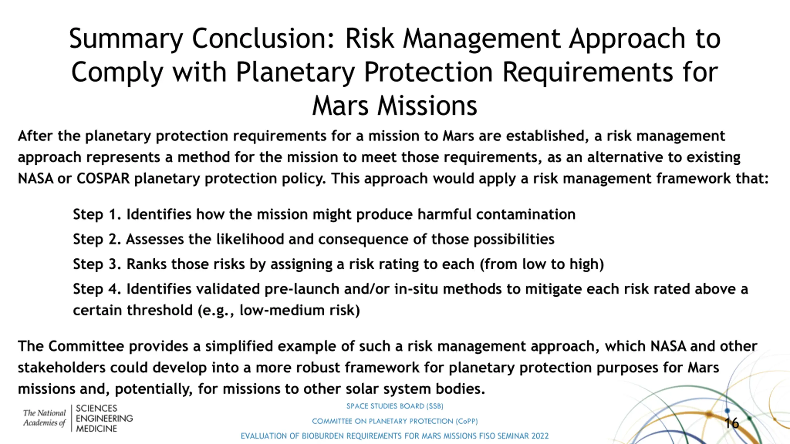 Study Findings Chapter 4: Risk Management and Post-Landing Approaches to Planetary Protection Finding 8: Planetary protection requirements for Mars missions can be met using a risk management approach as an alternative approach to meeting current NASA planetary protection requirements found in NPR 8020.012D Finding 9: In-situ bioburden reduction may present a cost-effective alternative or complement to prelaunch bioburden control and recontamination prevention measures. SPACE STUDIES BOARD (SSB) 15 COMMITTEE ON PLANETARY PROTECTION (CoPP) EVALUATION OF BIOBURDEN REQUIREMENTS FOR MARS MISSIONS FISO SEMINAR 2022