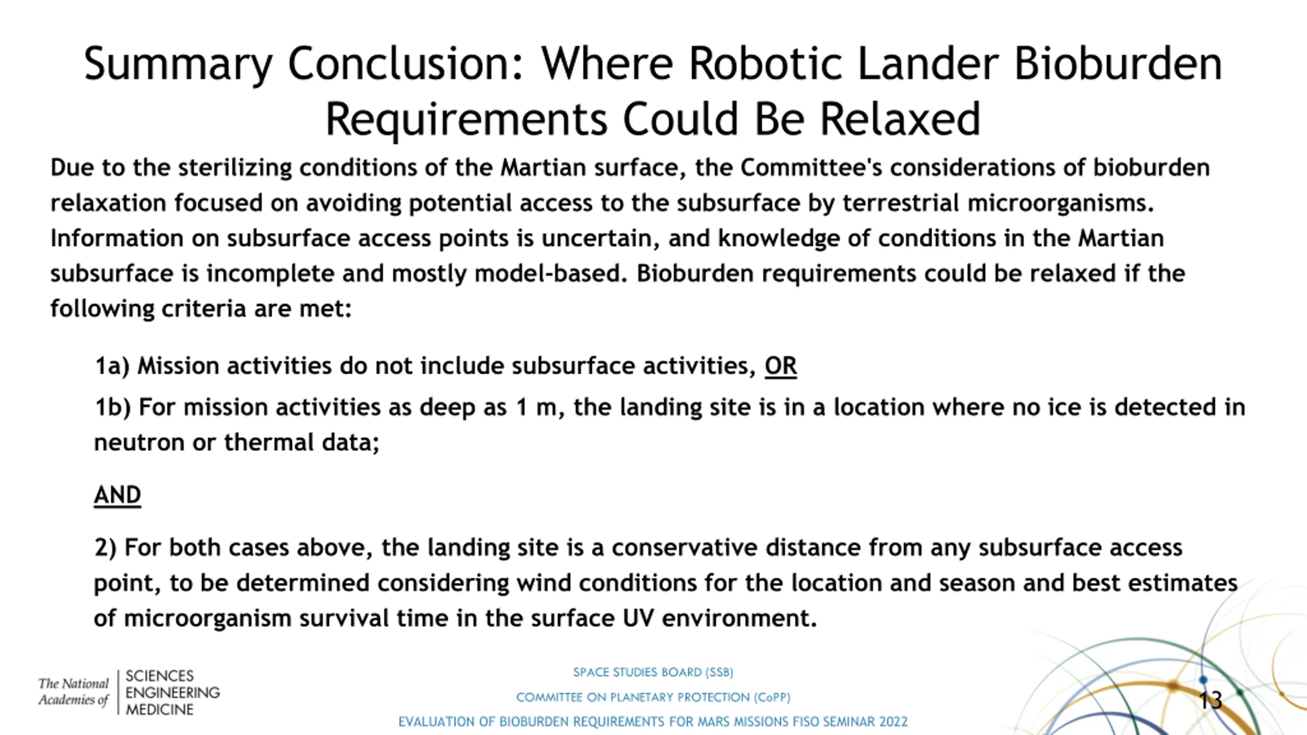 Summary Conclusion: Where Robotic Lander Bioburden Requirements Could Be Relaxed Due to the sterilizing conditions of the Martian surface, the Committee's considerations of bioburden relaxation focused on avoiding potential access to the subsurface by terrestrial microorganisms. Information on subsurface access points is uncertain, and knowledge of conditions in the Martian subsurface is incomplete and mostly model-based. Bioburden requirements could be relaxed if the following criteria are met: 1a) Mission activities do not include subsurface activities, OR 1b) For mission activities as deep as 1 m, the landing site is in a location where no ice is detected in neutron or thermal data; AND 2) For both cases above, the landing site is a conservative distance from any subsurface access point, to be determined considering wind conditions for the location and season and best estimates of microorganism survival time in the surface UV environment. SPACE STUDIES BOARD (SSB) 13 COMMITTEE ON PLANETARY PROTECTION (CoPP) EVALUATION OF BIOBURDEN REQUIREMENTS FOR MARS MISSIONS FISO SEMINAR 2022