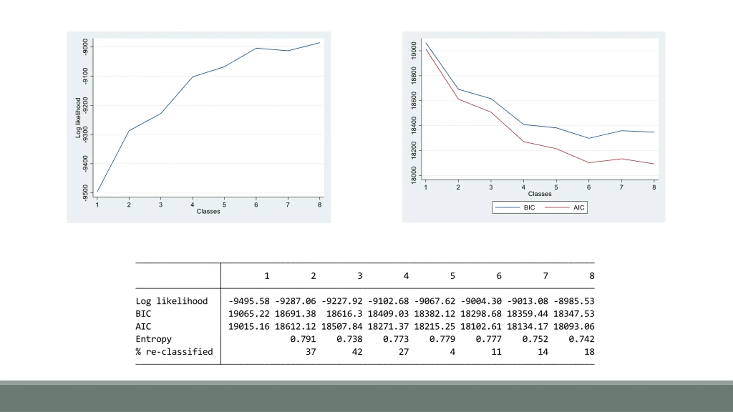 1 2 3 4 5 6 7 8 Log likelihood -9495.58 -9287.06 -9227.92 -9102.68 -9067.62 -9004.30 -9013.08 -8985.53 BIC 19065.22 18691.38 18616.3 18409.03 18382.12 18298.68 18359.44 18347.53 AIC 19015.16 18612.12 18507.84 18271.37 18215.25 18102.61 18134.17 18093.06 Entropy 0.791 0.738 0.773 0.779 0.777 0.752 0.742 % re-classified 37 42 27 4 11 14 18