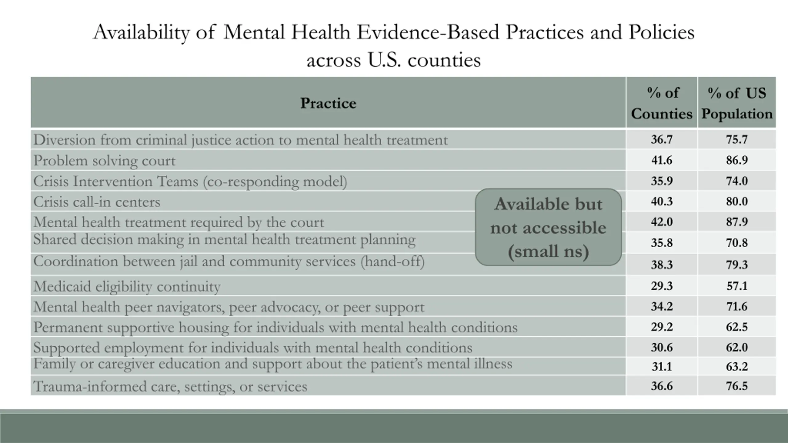Availability of Mental Health Evidence-Based Practices and Policies across U.S. counties % of Counties % of US Population Practice Diversion from criminal justice action to mental health treatment Problem solving court Crisis Intervention Teams (co-responding model) Crisis call-in centers Mental health treatment required by the court Shared decision making in mental health treatment planning Coordination between jail and community services (hand-off) Medicaid eligibility continuity Mental health peer navigators, peer advocacy, or peer support Permanent supportive housing for individuals with mental health conditions Supported employment for individuals with mental health conditions Family or caregiver education and support about the patient s mental illness Trauma-informed care, settings, or services 36.7 41.6 35.9 40.3 42.0 35.8 75.7 86.9 74.0 80.0 87.9 70.8 Available but not accessible (small ns) 38.3 79.3 29.3 34.2 29.2 30.6 31.1 36.6 57.1 71.6 62.5 62.0 63.2 76.5