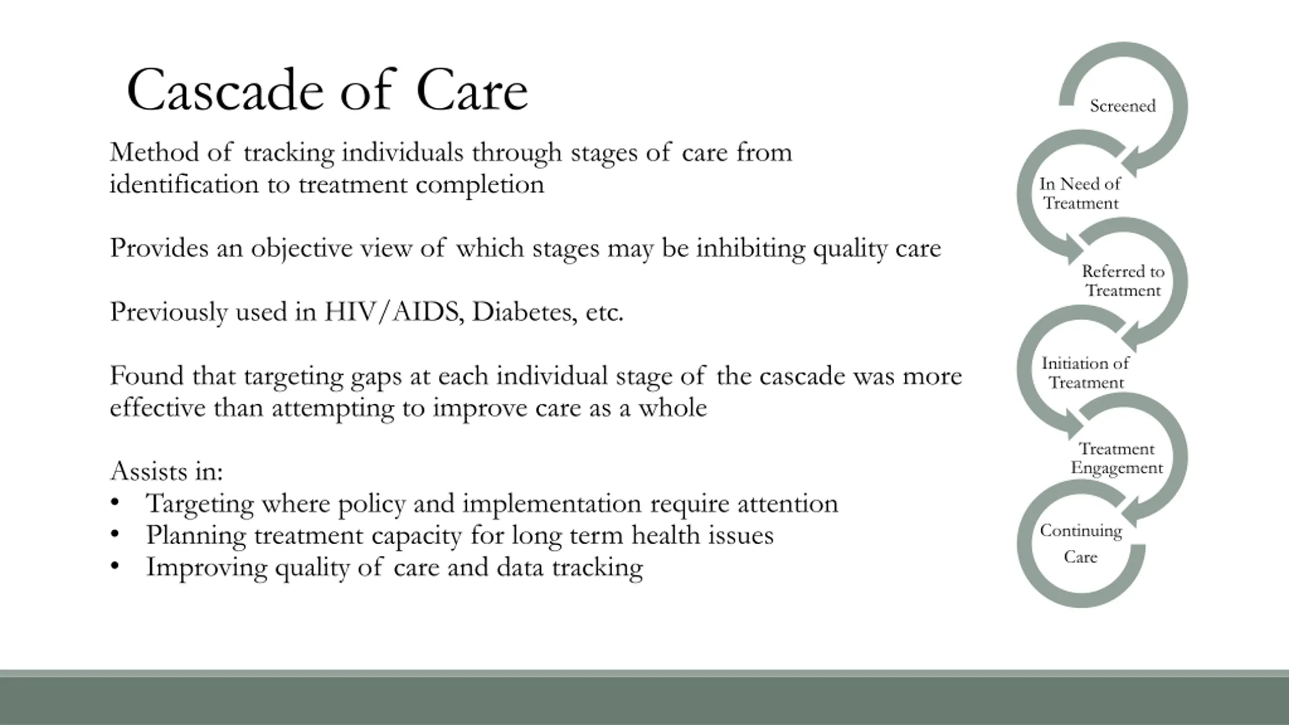 Cascade of Care Method of tracking individuals through stages of care from identification to treatment completion Screened In Need of Treatment Provides an objective view of which stages may be inhibiting quality care Referred to Treatment Previously used in HIV/AIDS, Diabetes, etc. Initiation of Treatment Found that targeting gaps at each individual stage of the cascade was more effective than attempting to improve care as a whole Treatment Engagement Assists in: Targeting where policy and implementation require attention Planning treatment capacity for long term health issues Improving quality of care and data tracking Continuing Care