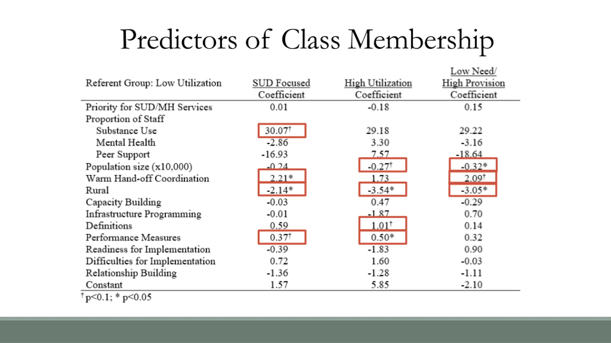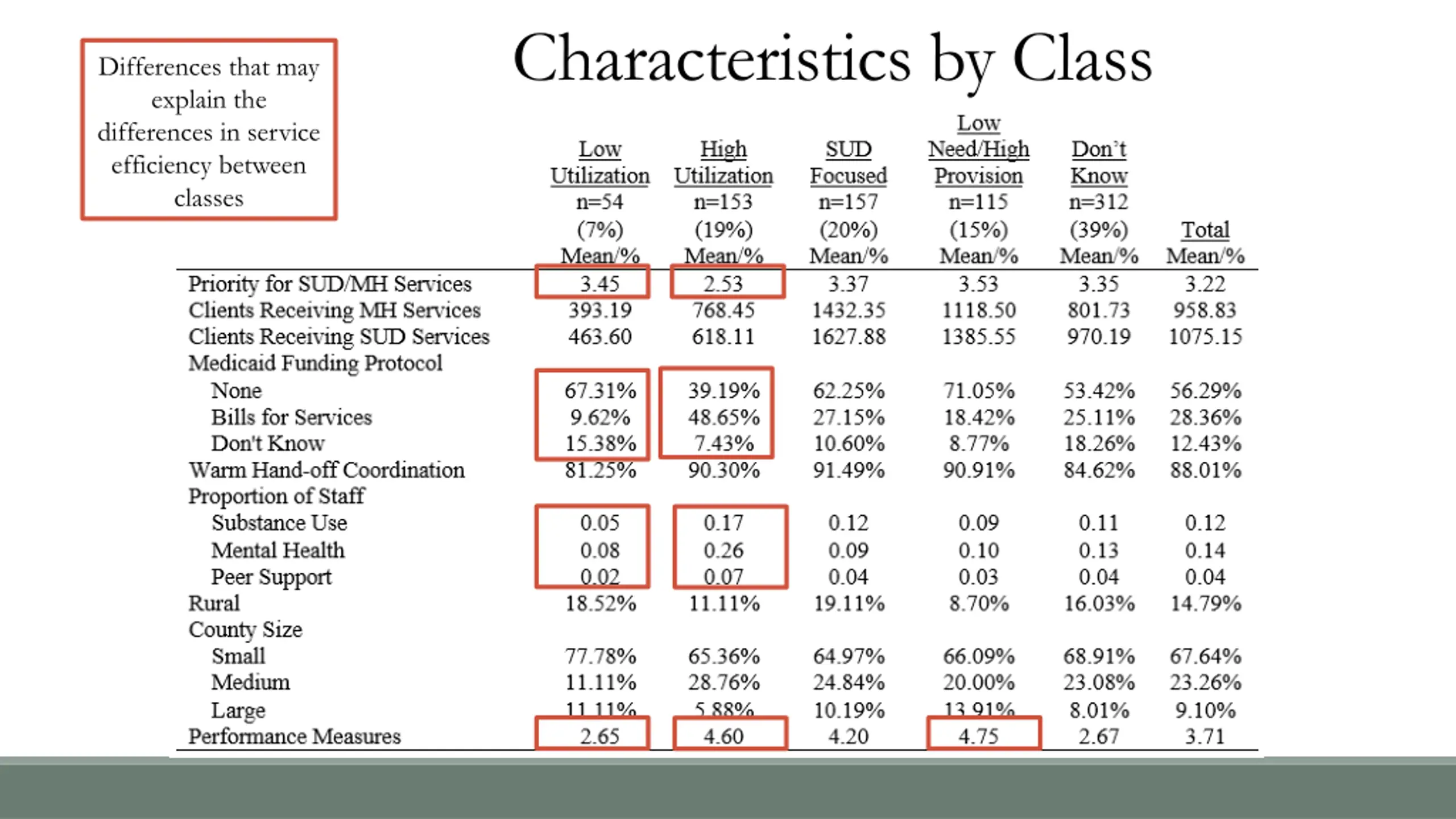 Study Aims and Methods Explore whether patterns exist on how agencies move clients through the cascade of care for mental health (MH) and substance use disorder (SUD) treatment. Method: Latent Class Analysis to identify patterns among PRACTITIONER REPORTED rates of positive screening, treatment referrals, and treatment engagement. Examine the characteristics of agencies that report shortfalls and gaps in care at various stages of the cascade. Method: Compare characteristics of agencies included in each latent class, as well as the group of agencies that reported not knowing their rates of use. Examine factors that predict class membership. Method: Simultaneous estimation of classes and predictors of class membership using GSEM