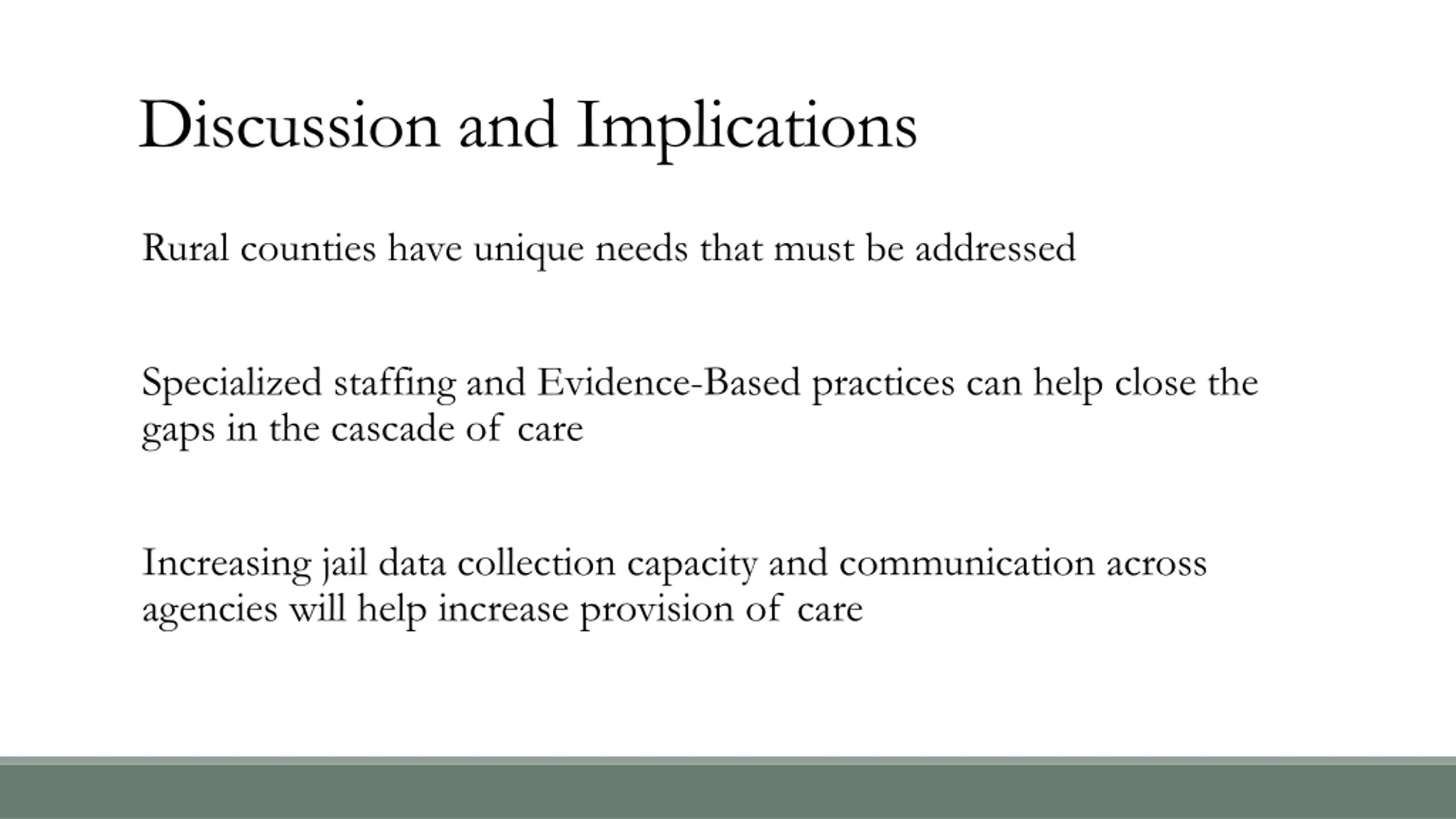 Discussion and Implications Rural counties have unique needs that must be addressed Specialized staffing and Evidence-Based practices can help close the gaps in the cascade of care Increasing jail data collection capacity and communication across agencies will help increase provision of care