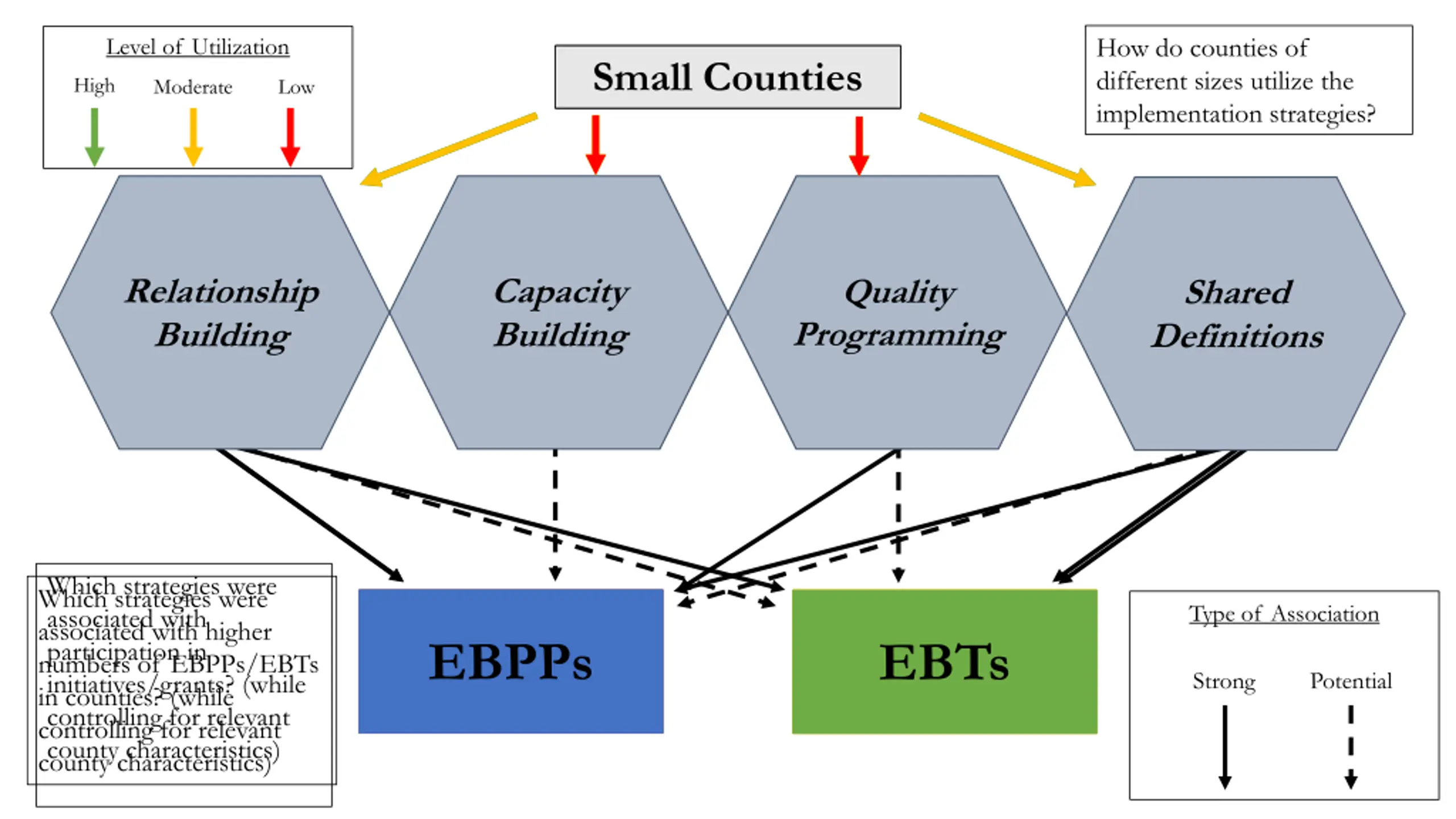 How do counties of different sizes utilize the implementation strategies? Level of Utilization Large Counties Medium Counties Small Counties High Moderate Low Relationship Building Capacity Building Quality Programming Shared Definitions Which strategies were associated with participation in initiatives/grants? (while controlling for relevant county characteristics) Which strategies were associated with higher numbers of EBPPs/EBTs in counties? (while controlling for relevant county characteristics) National Initiatives Grant Programs Type of Association EBPPs EBTs Strong Potential