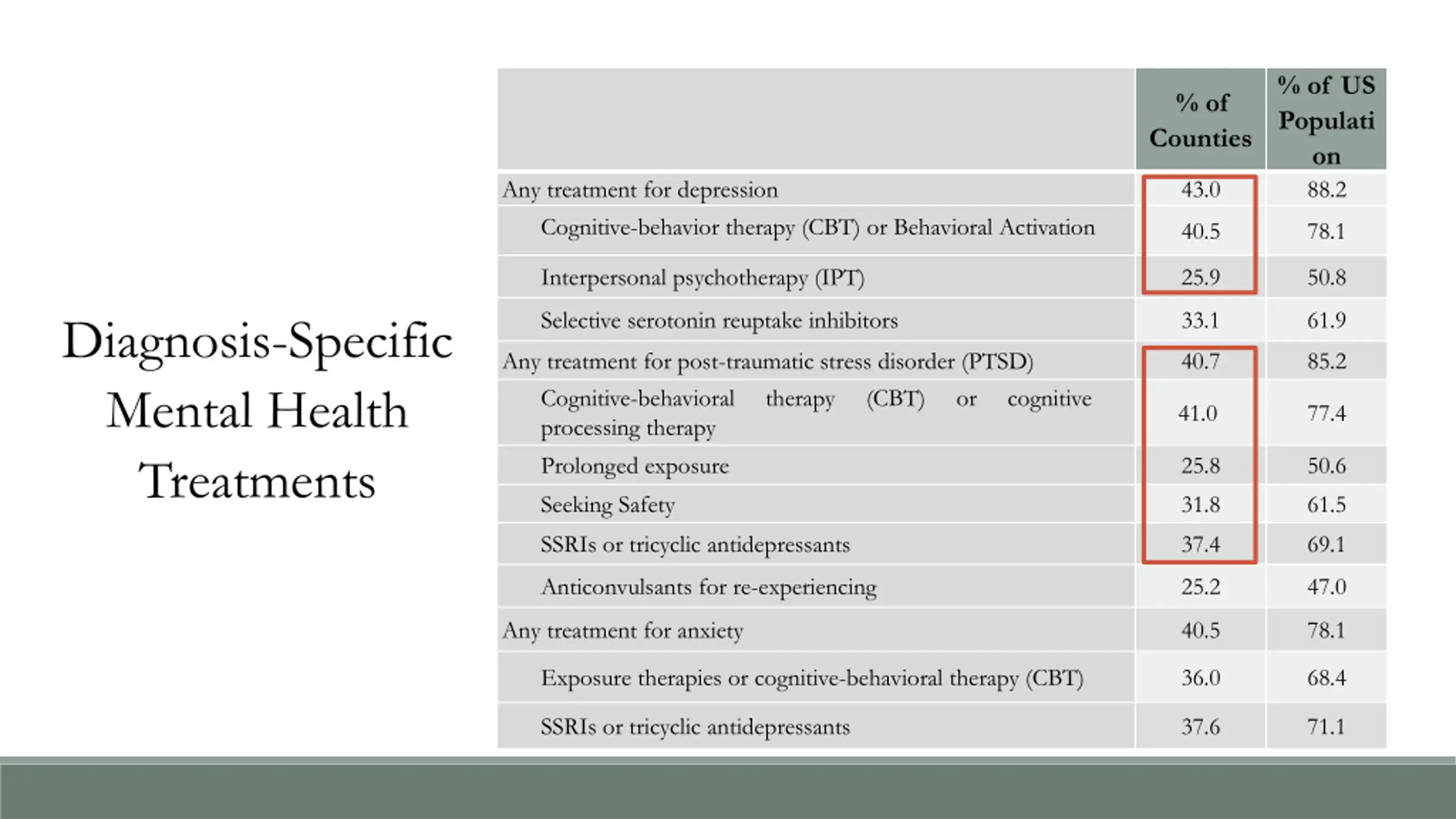 % of US Populati on 88.2 % of Counties Any treatment for depression Cognitive-behavior therapy (CBT) or Behavioral Activation 43.0 40.5 78.1 Interpersonal psychotherapy (IPT) 25.9 50.8 Selective serotonin reuptake inhibitors 33.1 61.9 Diagnosis-Specific Mental Health Treatments Any treatment for post-traumatic stress disorder (PTSD) Cognitive-behavioral therapy processing therapy Prolonged exposure Seeking Safety 40.7 85.2 (CBT) or cognitive 41.0 77.4 25.8 31.8 50.6 61.5 SSRIs or tricyclic antidepressants 37.4 69.1 Anticonvulsants for re-experiencing 25.2 47.0 Any treatment for anxiety 40.5 78.1 Exposure therapies or cognitive-behavioral therapy (CBT) 36.0 68.4 SSRIs or tricyclic antidepressants 37.6 71.1