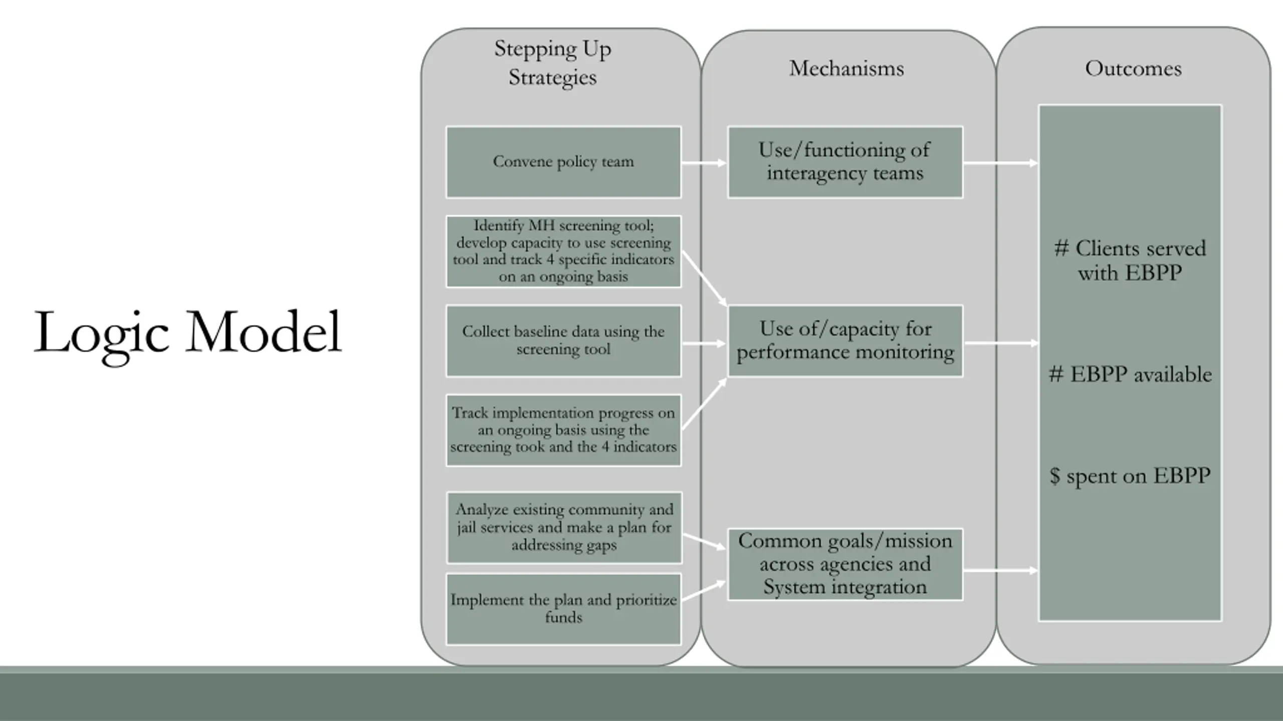 Stepping Up Strategies Mechanisms Outcomes Use/functioning of interagency teams Convene policy team Identify MH screening tool; develop capacity to use screening tool and track 4 specific indicators on an ongoing basis # Clients served with EBPP Logic Model Use of/capacity for performance monitoring Collect baseline data using the screening tool # EBPP available Track implementation progress on an ongoing basis using the screening took and the 4 indicators $ spent on EBPP Analyze existing community and jail services and make a plan for addressing gaps Common goals/mission across agencies and System integration Implement the plan and prioritize funds