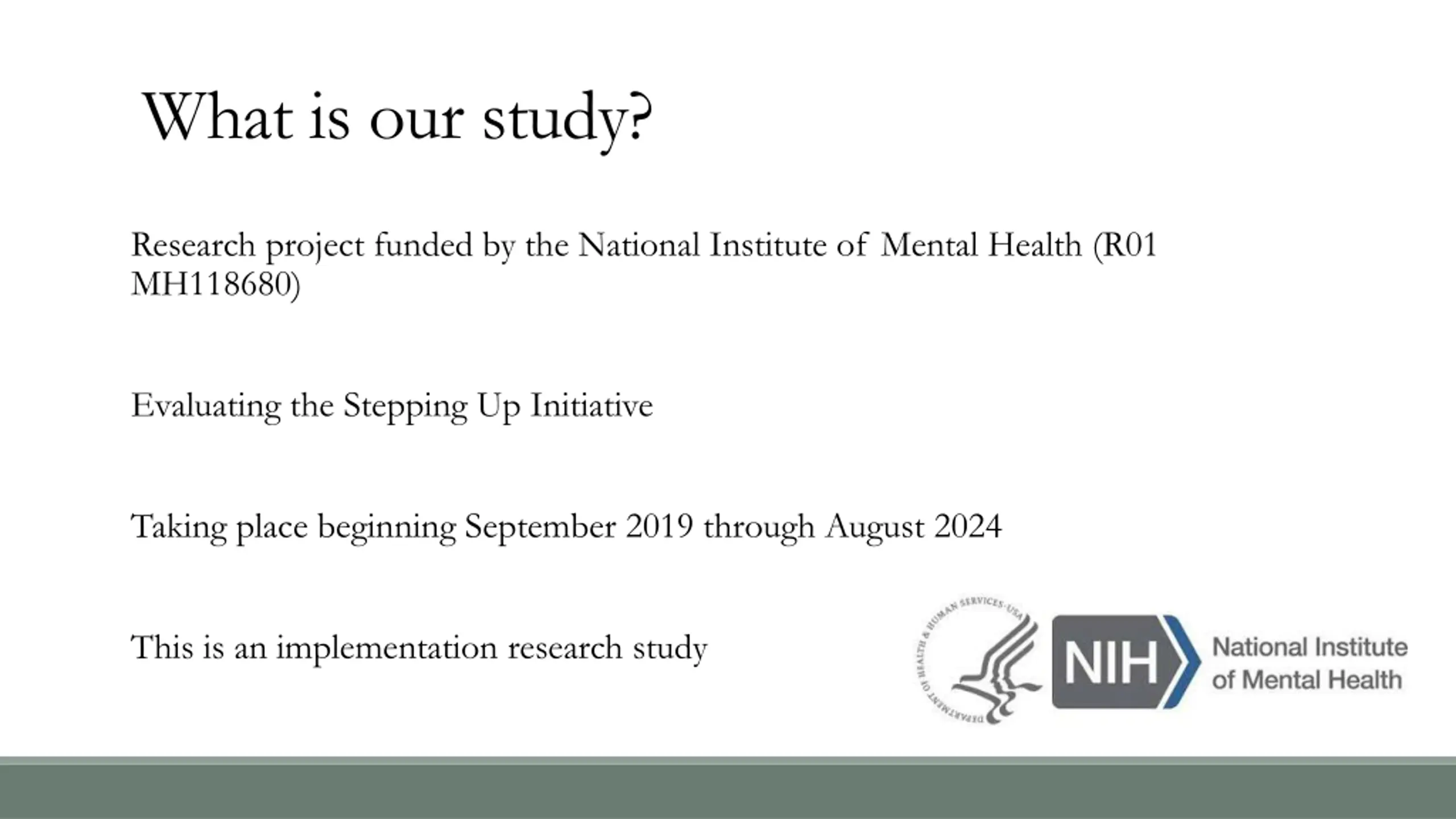 What is our study? Research project funded by the National Institute of Mental Health (R01 MH118680) Evaluating the Stepping Up Initiative Taking place beginning September 2019 through August 2024 This is an implementation research study