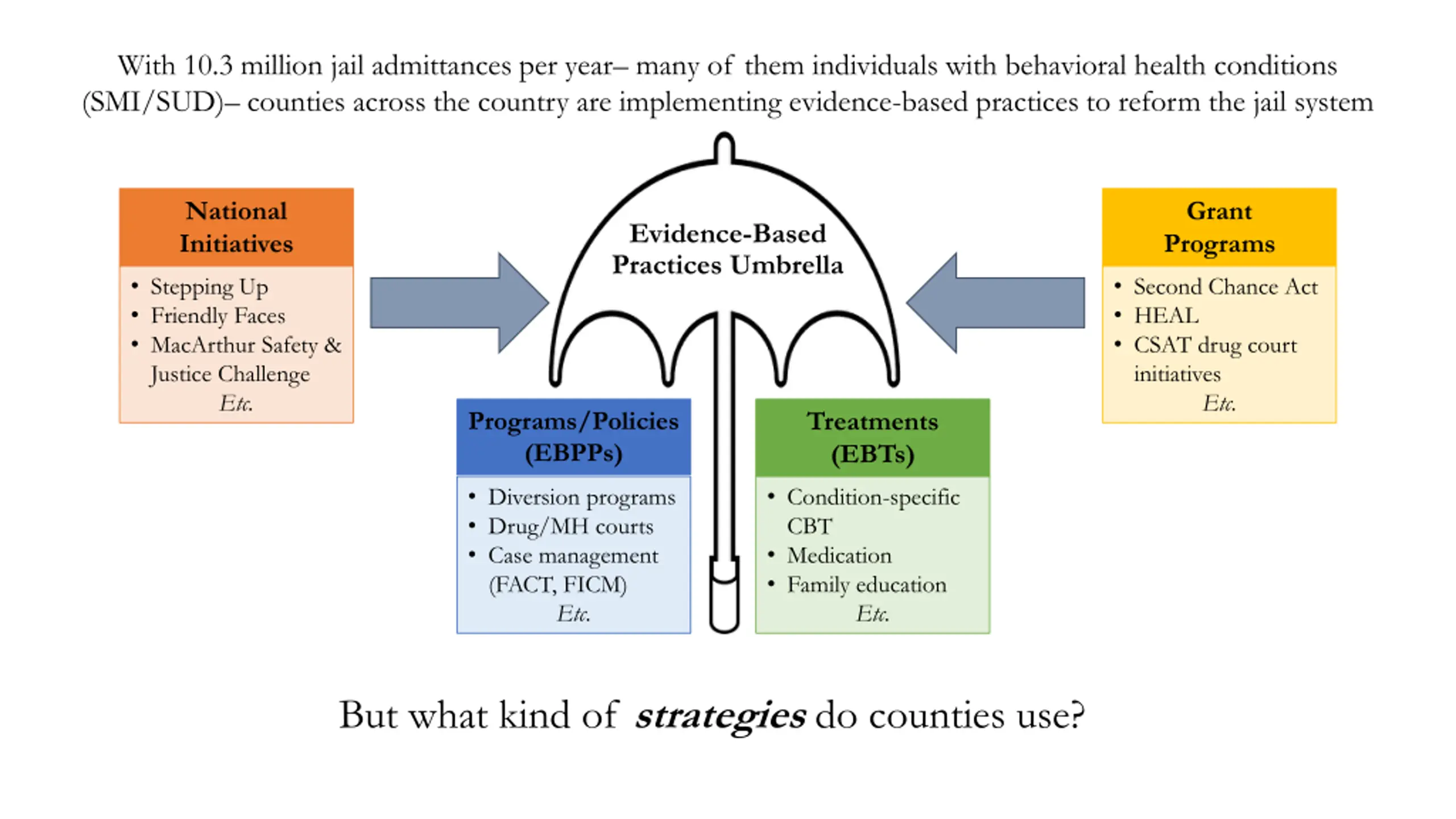 With 10.3 million jail admittances per year many of them individuals with behavioral health conditions (SMI/SUD) counties across the country are implementing evidence-based practices to reform the jail system National Initiatives Grant Programs Evidence-Based Practices Umbrella Stepping Up Friendly Faces MacArthur Safety & Justice Challenge Etc. Second Chance Act HEAL CSAT drug court initiatives Etc. Programs/Policies (EBPPs) Treatments (EBTs) Diversion programs Drug/MH courts Case management (FACT, FICM) Etc. Condition-specific CBT Medication Family education Etc. But what kind of strategies do counties use?