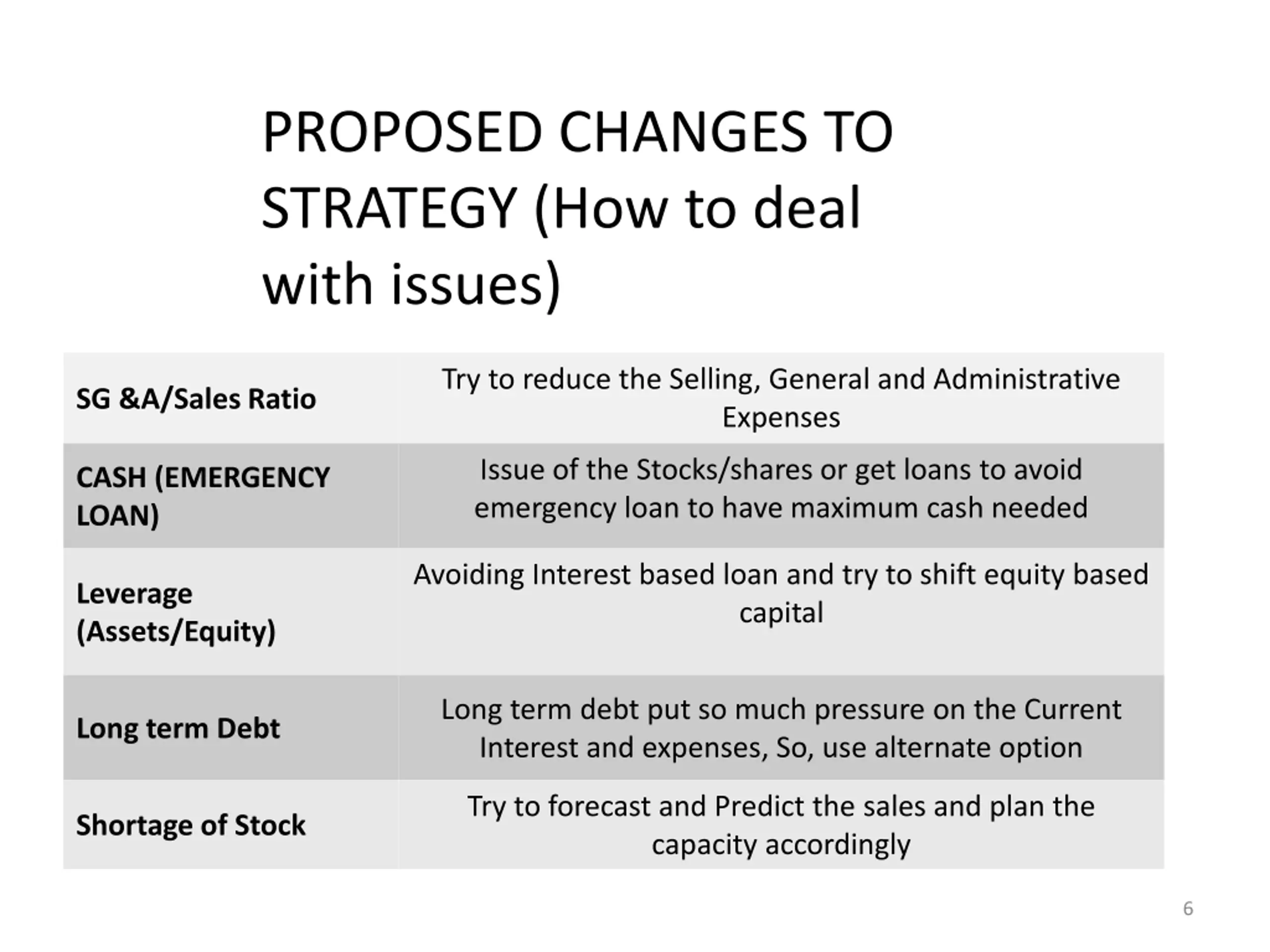 PROPOSED CHANGES TO STRATEGY (How to deal with issues) Try to reduce the Selling, General and Administrative Expenses SG &A/Sales Ratio Issue of the Stocks/shares or get loans to avoid emergency loan to have maximum cash needed CASH (EMERGENCY LOAN) Avoiding Interest based loan and try to shift equity based capital Leverage (Assets/Equity) Long term debt put so much pressure on the Current Interest and expenses, So, use alternate option Long term Debt Try to forecast and Predict the sales and plan the capacity accordingly Shortage of Stock 6