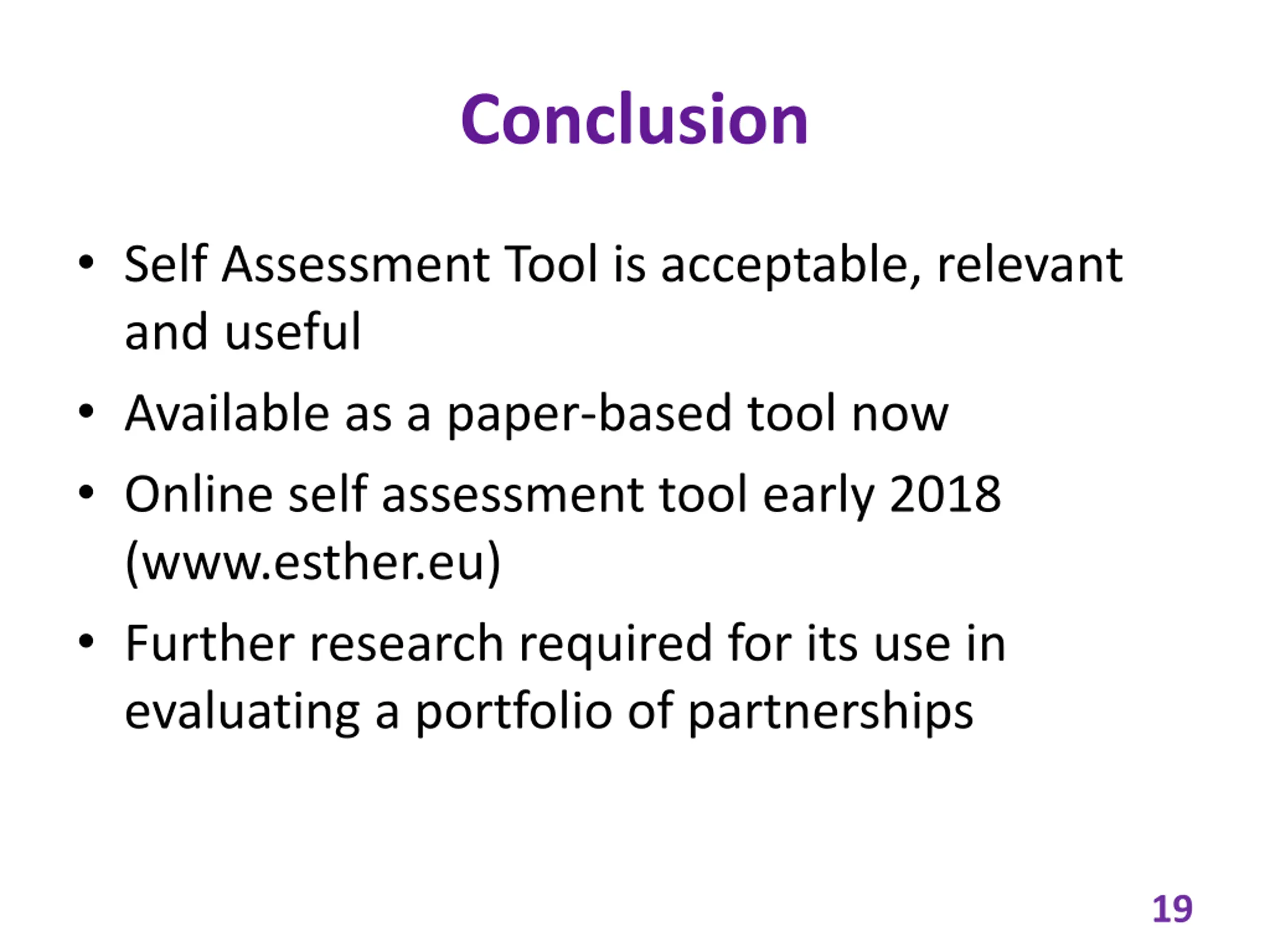 Conclusion Self Assessment Tool is acceptable, relevant and useful Available as a paper-based tool now Online self assessment tool early 2018 (www.esther.eu) Further research required for its use in evaluating a portfolio of partnerships 19