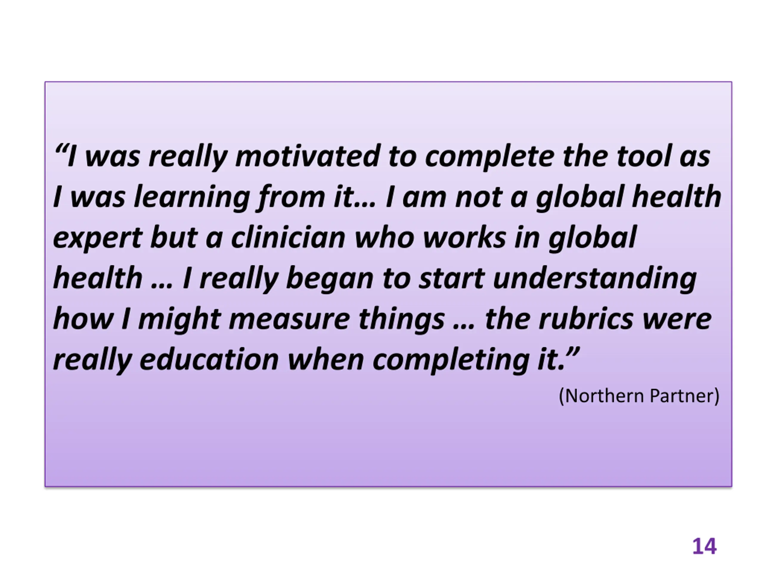 I was really motivated to complete the tool as I was learning from it I am not a global health expert but a clinician who works in global health I really began to start understanding how I might measure things the rubrics were really education when completing it. (Northern Partner) 14