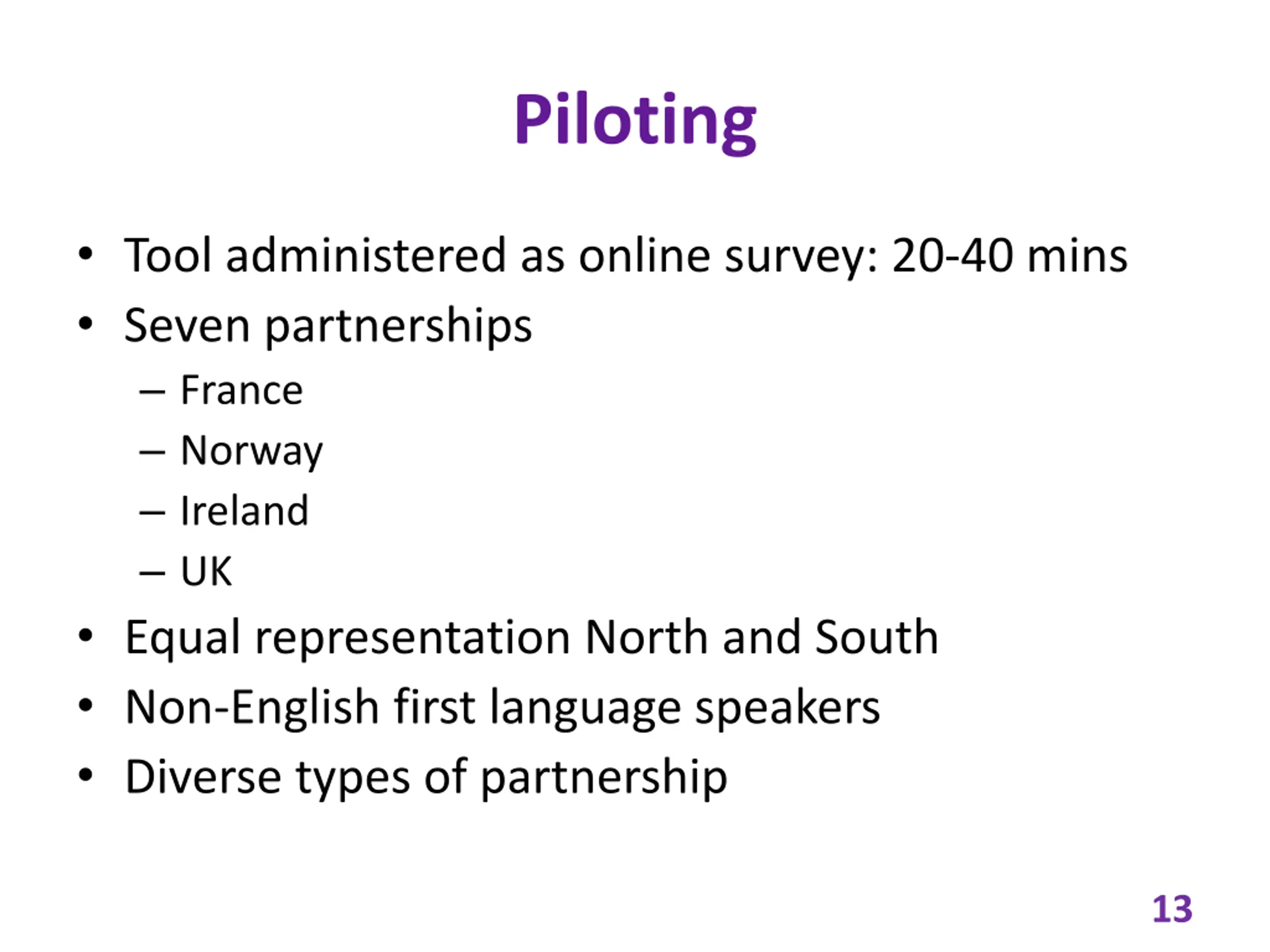 Piloting Tool administered as online survey: 20-40 mins Seven partnerships France Norway Ireland UK Equal representation North and South Non-English first language speakers Diverse types of partnership 13