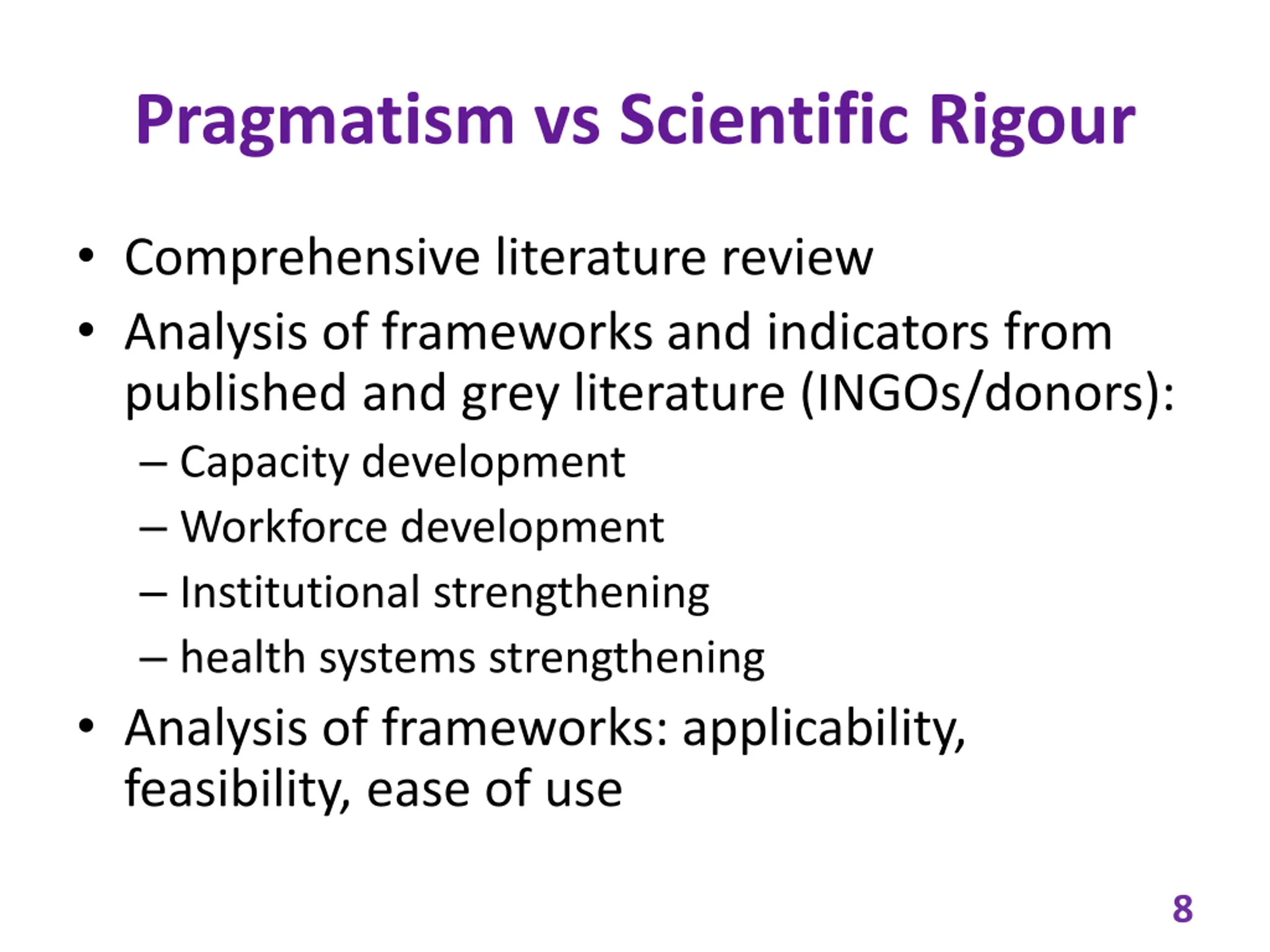 Pragmatism vs Scientific Rigour Comprehensive literature review Analysis of frameworks and indicators from published and grey literature (INGOs/donors): Capacity development Workforce development Institutional strengthening health systems strengthening Analysis of frameworks: applicability, feasibility, ease of use 8