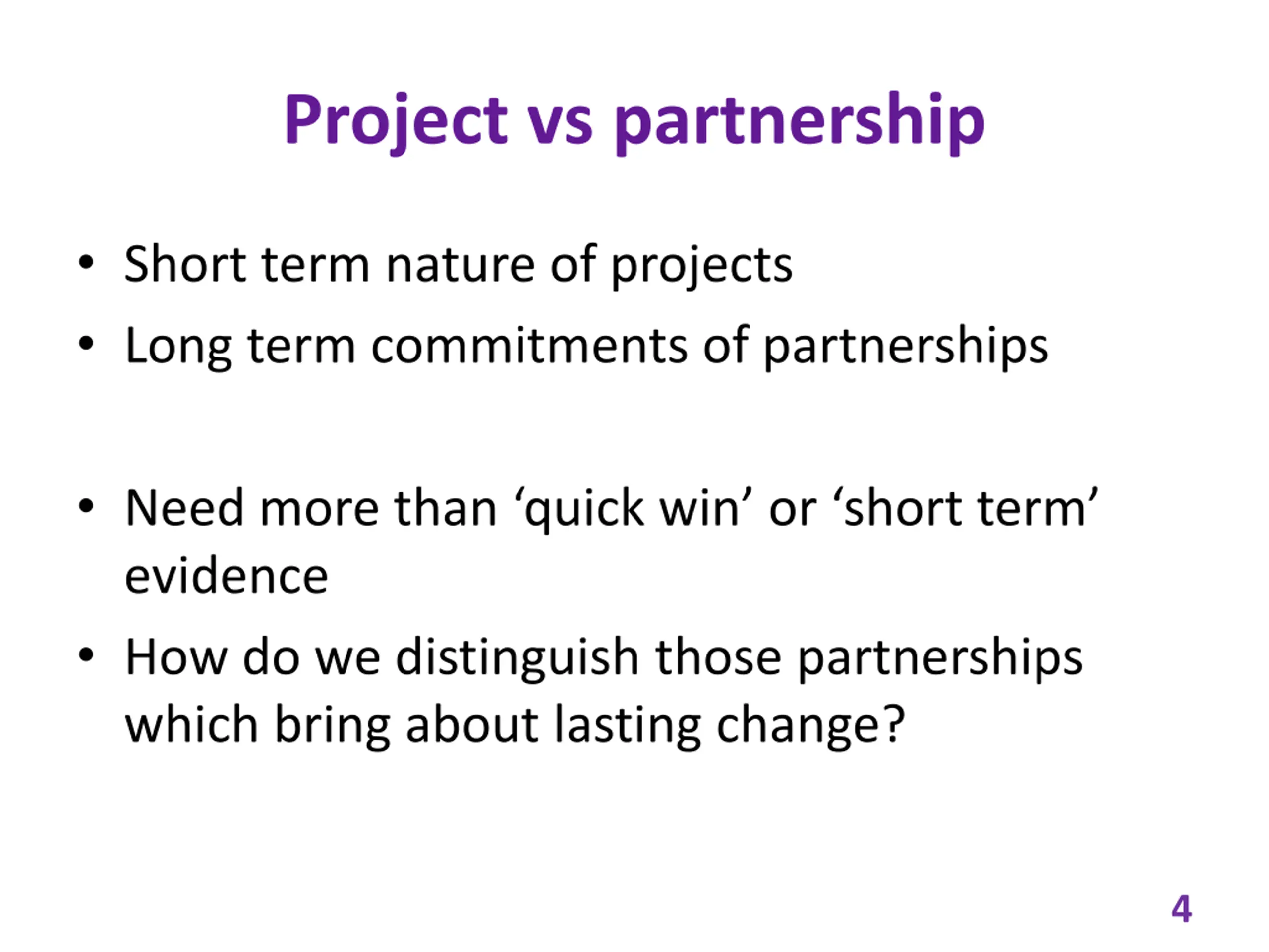 Project vs partnership Short term nature of projects Long term commitments of partnerships Need more than quick win or short term evidence How do we distinguish those partnerships which bring about lasting change? 4