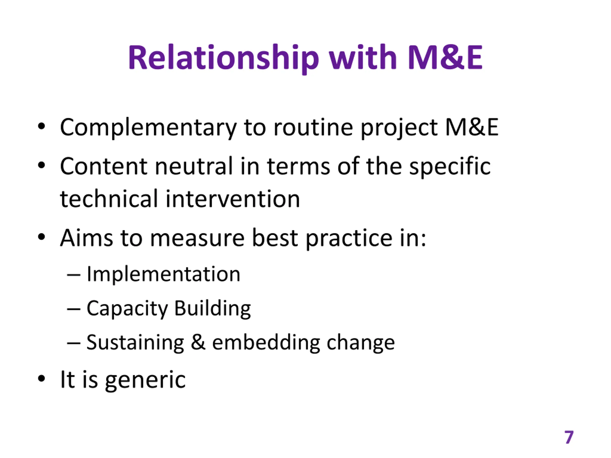 Relationship with M&E Complementary to routine project M&E Content neutral in terms of the specific technical intervention Aims to measure best practice in: Implementation Capacity Building Sustaining & embedding change It is generic 7