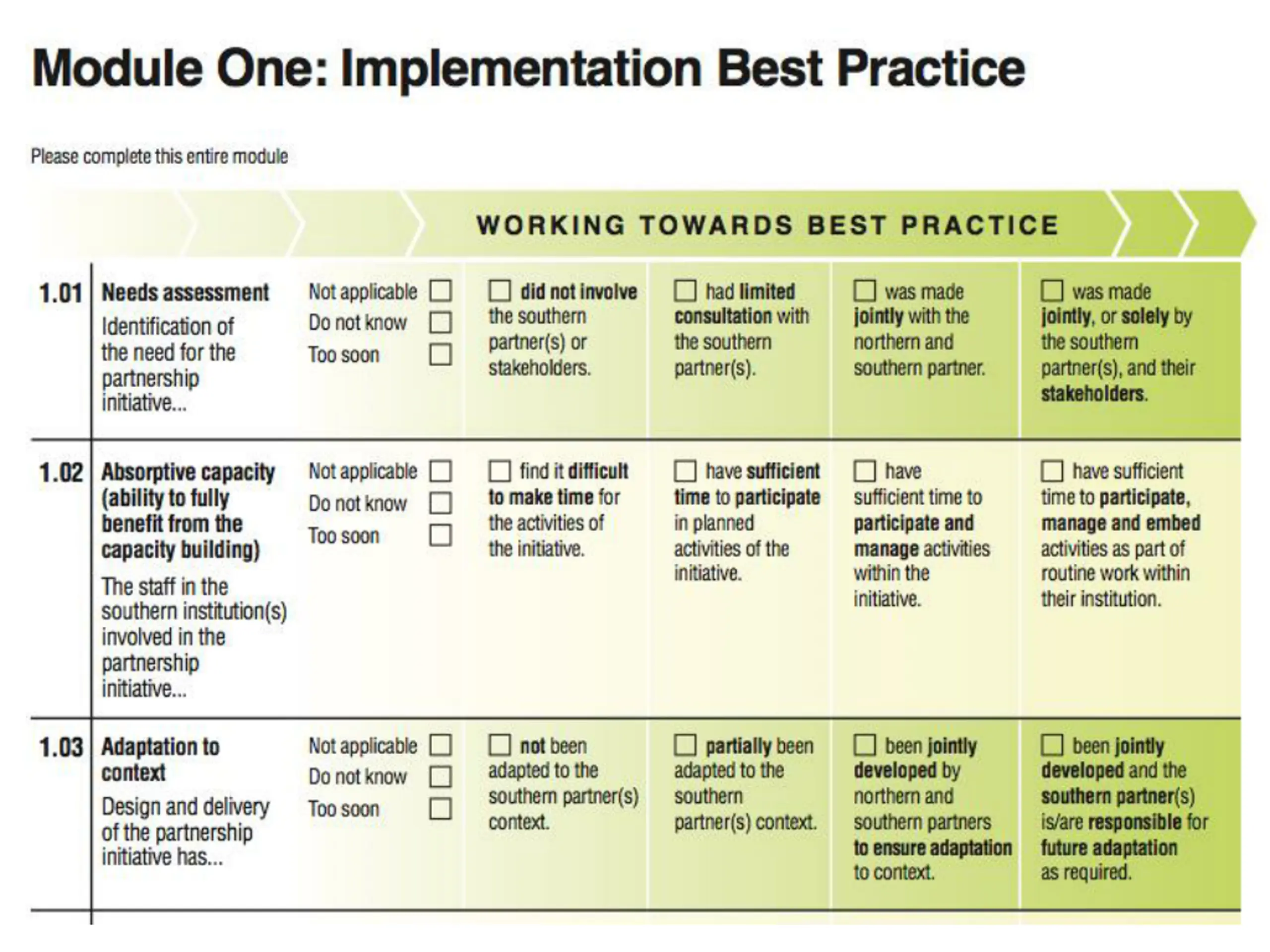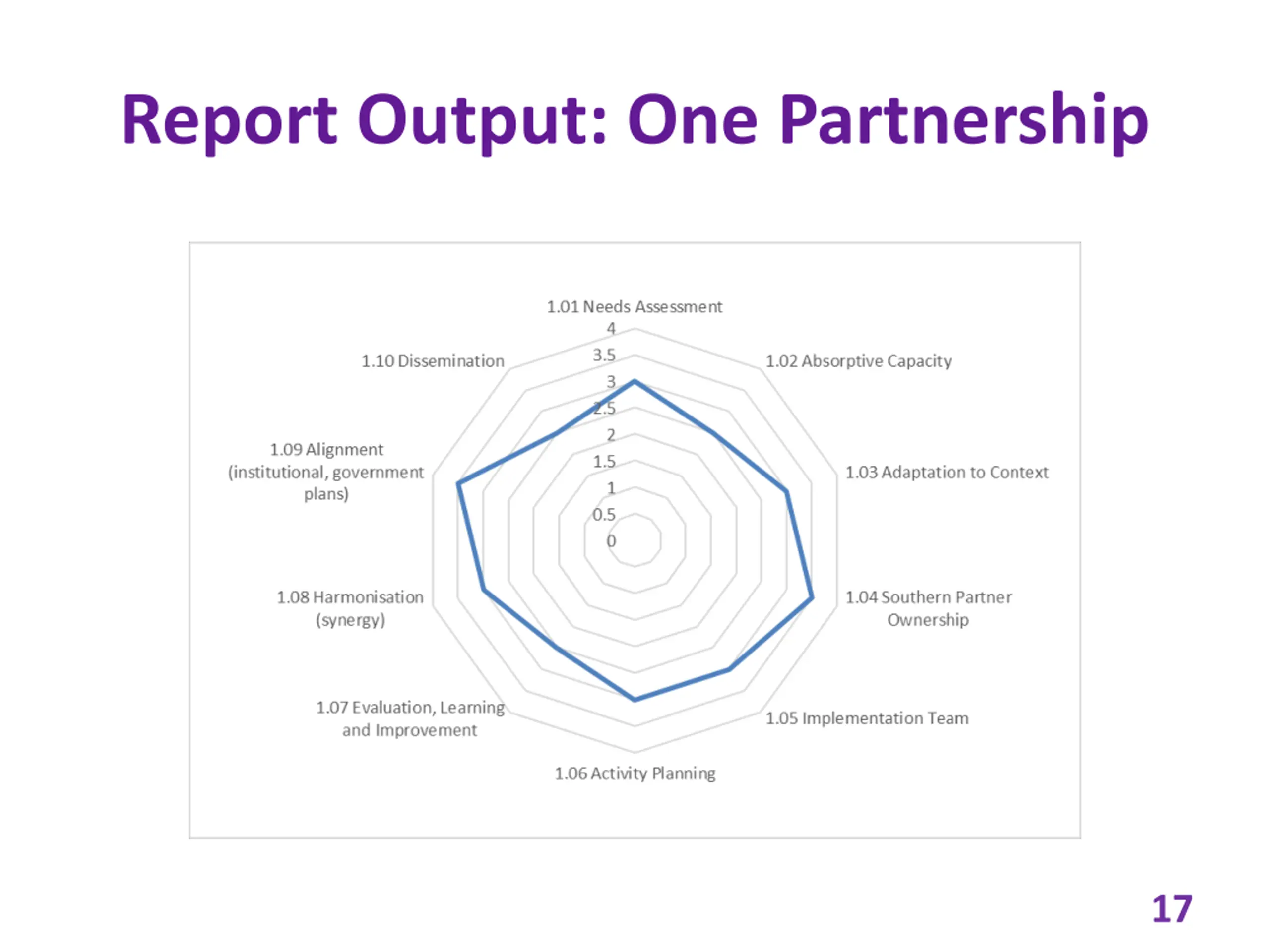 Report Output: One partnership Needs assessment Identification of the need for the partnership initiative was made jointly, or solely by the southern partner/s, and their stakeholders. did not involve the southern partner/s or stakeholders. had limited consultation with the southern partner/s. was made jointly with the northern and southern partner. 1.01 Frequency 2 Absorptive capacity The staff in the southern institution(s) involved in the partnership initiative have sufficient time to participate, manage and embed activities as part of routine work within their institution find it difficult to make time for the activities of the partnership initiative. have sufficient time to participate and manage activities within the initiative. have sufficient time to participate in planned activities. 1.02 Frequency 1 1 been jointly developed by northern and southern partners to ensure adaptation to the southern partner/s context. The southern partner/s is responsible for continued adaptation to the changing local context. been jointly developed by northern and southern partners to ensure adaptation to the southern partner(s) context. Adaptation to context Design and delivery of the partnership initiative has not been adapted to the southern partner/s context. partially been adapted to the southern partner/s context. 1.03 16
