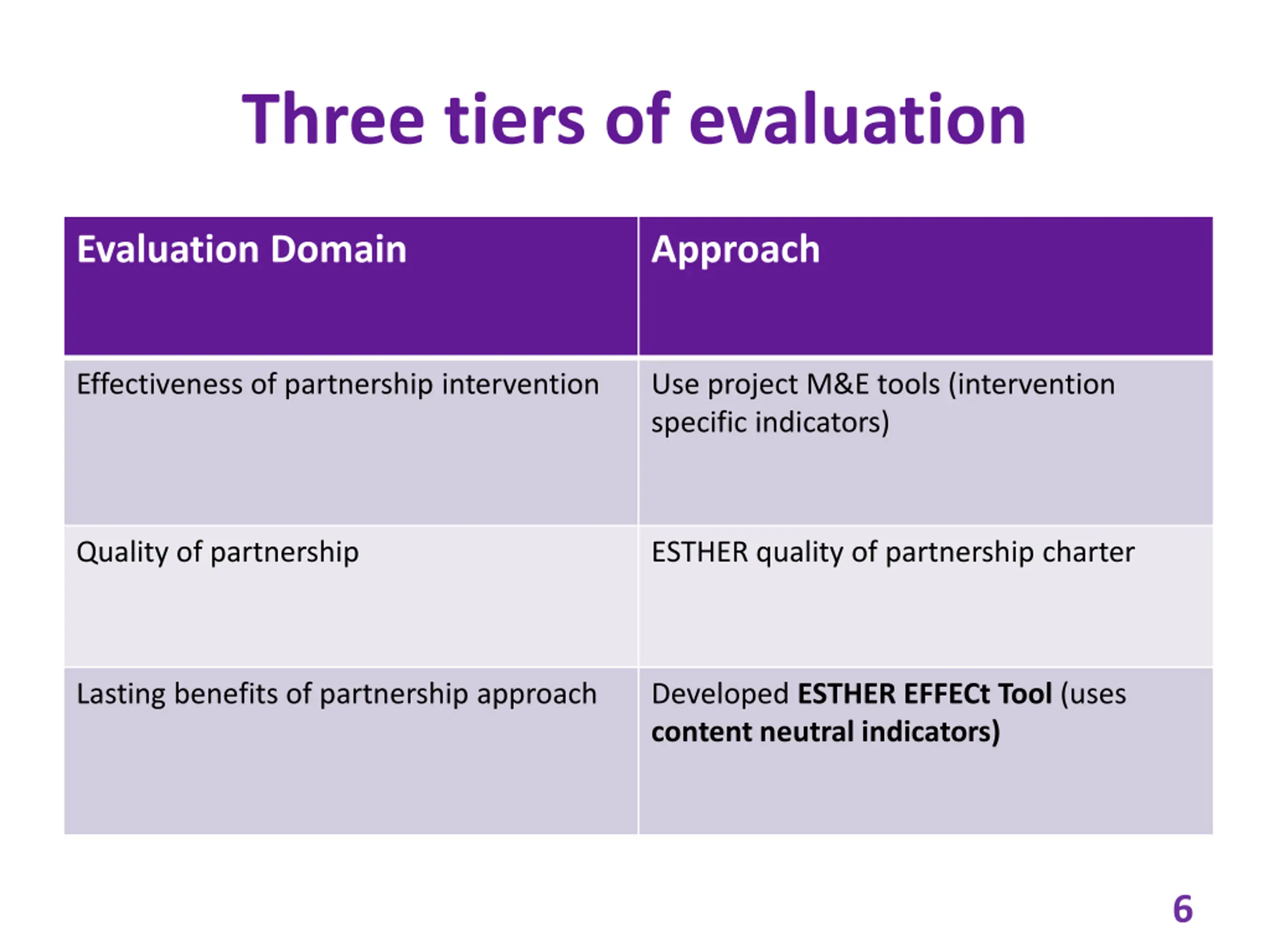 Three tiers of evaluation Evaluation Domain Approach Effectiveness of partnership intervention Use project M&E tools (intervention specific indicators) Quality of partnership ESTHER quality of partnership charter Lasting benefits of partnership approach Developed ESTHER EFFECt Tool (uses content neutral indicators) 6