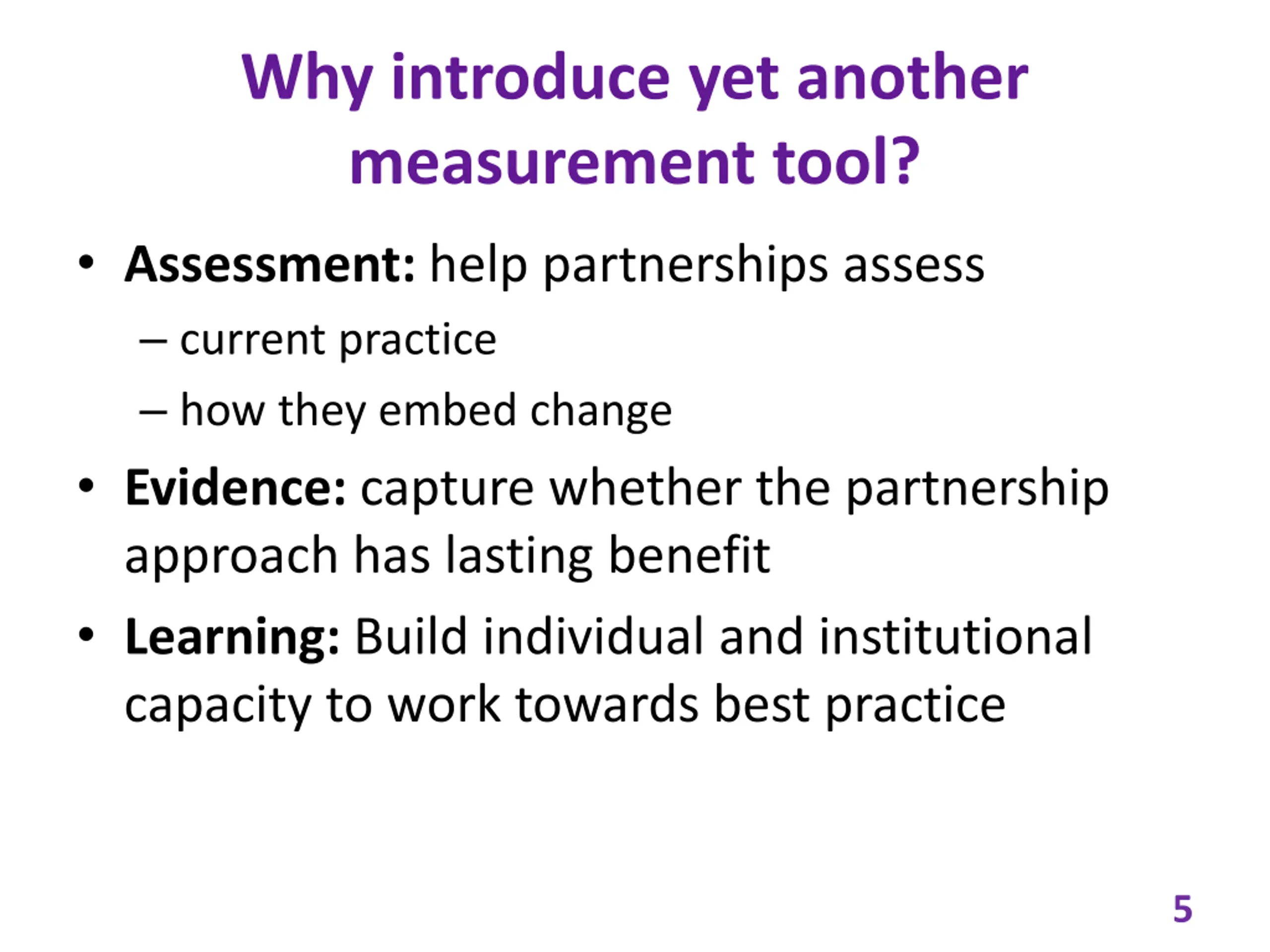 Why introduce yet another measurement tool? Assessment: help partnerships assess current practice how they embed change Evidence: capture whether the partnership approach has lasting benefit Learning: Build individual and institutional capacity to work towards best practice 5