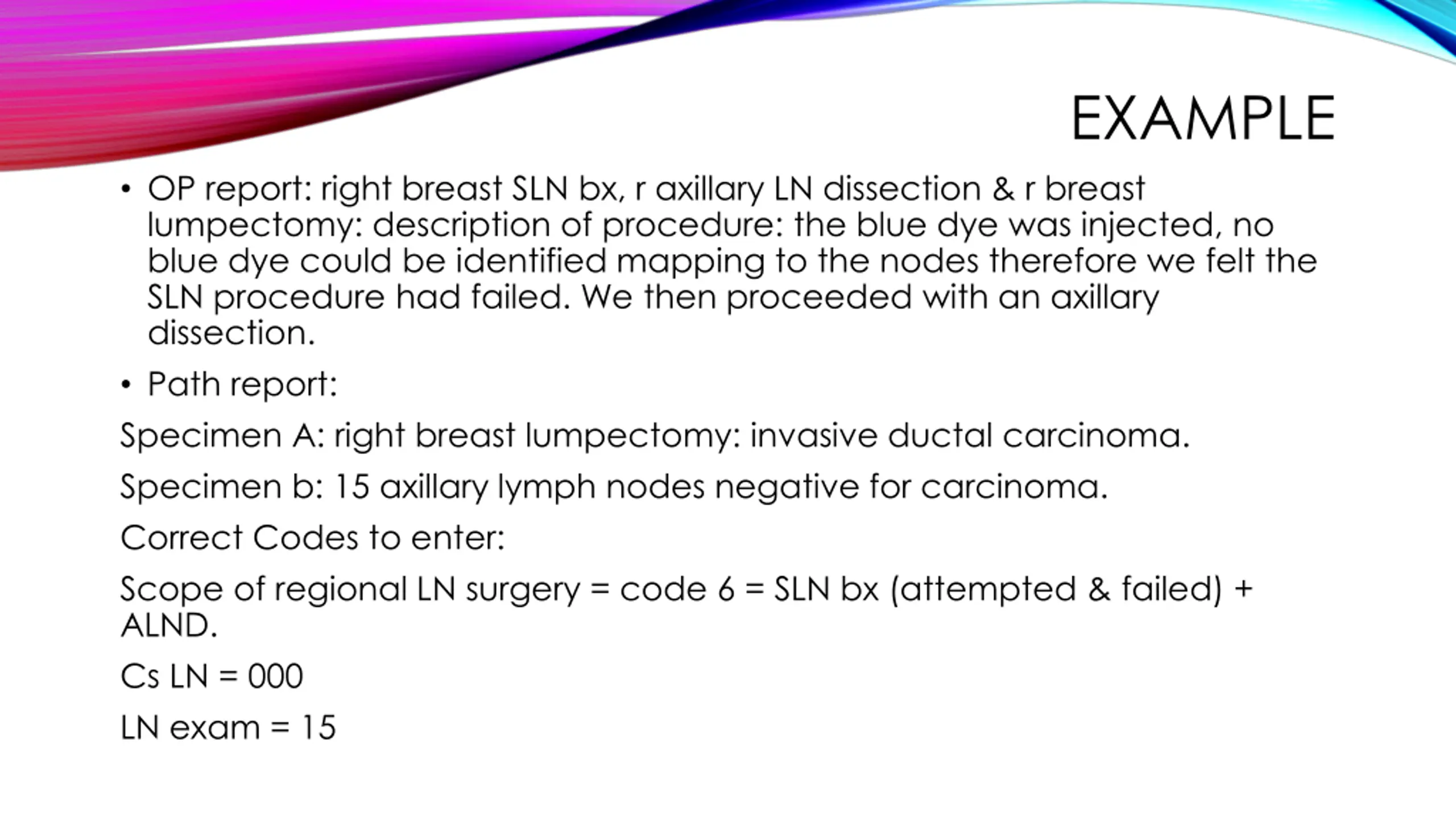 EXAMPLE OP report: right breast SLN bx, r axillary LN dissection & r breast lumpectomy: description of procedure: the blue dye was injected, no blue dye could be identified mapping to the nodes therefore we felt the SLN procedure had failed. We then proceeded with an axillary dissection. Path report: Specimen A: right breast lumpectomy: invasive ductal carcinoma. Specimen b: 15 axillary lymph nodes negative for carcinoma. Correct Codes to enter: Scope of regional LN surgery = code 6 = SLN bx (attempted & failed) + ALND. Cs LN = 000 LN exam = 15