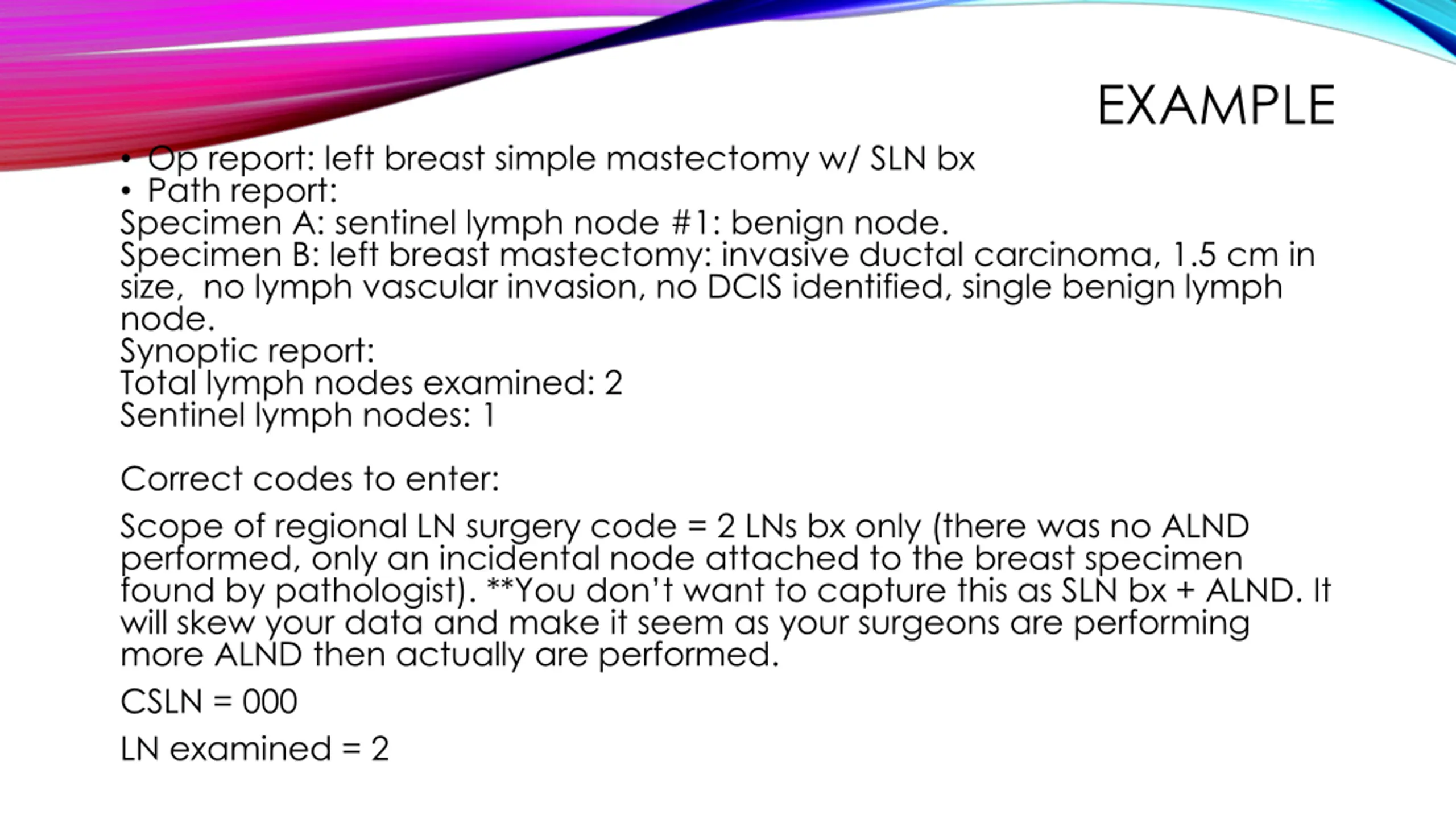 EXAMPLE Op report: left breast simple mastectomy w/ SLN bx Path report: Specimen A: sentinel lymph node #1: benign node. Specimen B: left breast mastectomy: invasive ductal carcinoma, 1.5 cm in size, no lymph vascular invasion, no DCIS identified, single benign lymph node. Synoptic report: Total lymph nodes examined: 2 Sentinel lymph nodes: 1 Correct codes to enter: Scope of regional LN surgery code = 2 LNs bx only (there was no ALND performed, only an incidental node attached to the breast specimen found by pathologist). **You don t want to capture this as SLN bx + ALND. It will skew your data and make it seem as your surgeons are performing more ALND then actually are performed. CSLN = 000 LN examined = 2