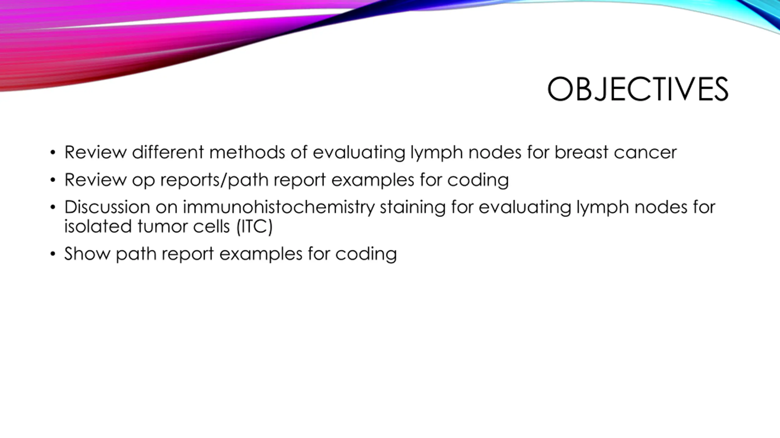 OBJECTIVES Review different methods of evaluating lymph nodes for breast cancer Review op reports/path report examples for coding Discussion on immunohistochemistry staining for evaluating lymph nodes for isolated tumor cells (ITC) Show path report examples for coding