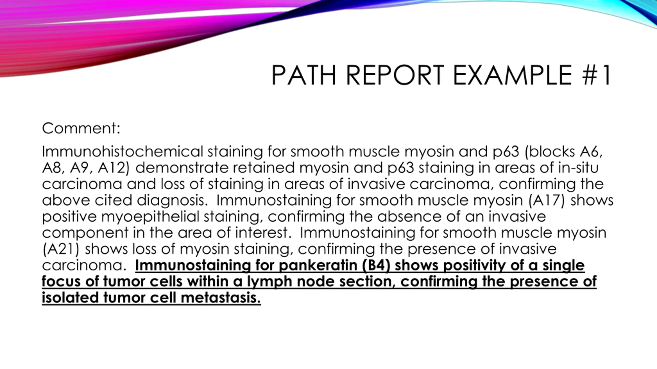 PATH REPORT EXAMPLE #1 Comment: Immunohistochemical staining for smooth muscle myosin and p63 (blocks A6, A8, A9, A12) demonstrate retained myosin and p63 staining in areas of in-situ carcinoma and loss of staining in areas of invasive carcinoma, confirming the above cited diagnosis. Immunostaining for smooth muscle myosin (A17) shows positive myoepithelial staining, confirming the absence of an invasive component in the area of interest. Immunostaining for smooth muscle myosin (A21) shows loss of myosin staining, confirming the presence of invasive carcinoma. Immunostaining for pankeratin (B4) shows positivity of a single focus of tumor cells within a lymph node section, confirming the presence of isolated tumor cell metastasis.