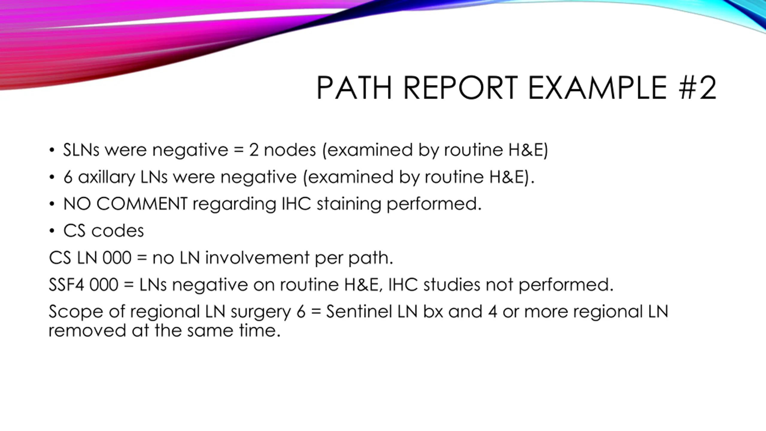 PATH REPORT EXAMPLE #2 SLNs were negative = 2 nodes (examined by routine H&E) 6 axillary LNs were negative (examined by routine H&E). NO COMMENT regarding IHC staining performed. CS codes CS LN 000 = no LN involvement per path. SSF4 000 = LNs negative on routine H&E, IHC studies not performed. Scope of regional LN surgery 6 = Sentinel LN bx and 4 or more regional LN removed at the same time.