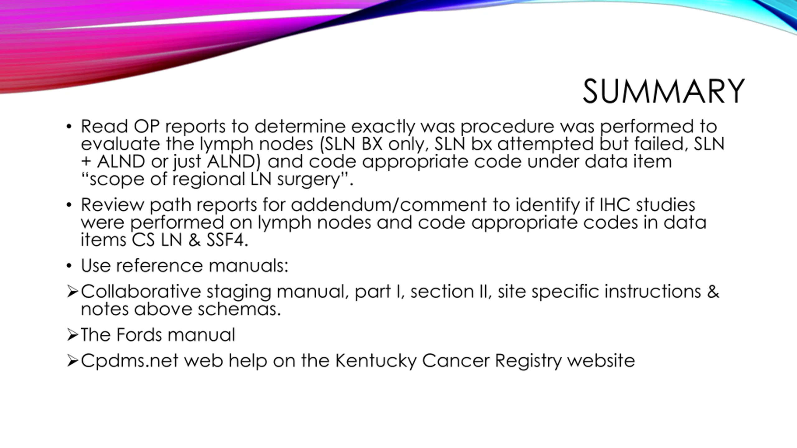 SUMMARY Read OP reports to determine exactly was procedure was performed to evaluate the lymph nodes (SLN BX only, SLN bx attempted but failed, SLN + ALND or just ALND) and code appropriate code under data item scope of regional LN surgery . Review path reports for addendum/comment to identify if IHC studies were performed on lymph nodes and code appropriate codes in data items CS LN & SSF4. Use reference manuals: Collaborative staging manual, part I, section II, site specific instructions & notes above schemas. The Fords manual Cpdms.net web help on the Kentucky Cancer Registry website