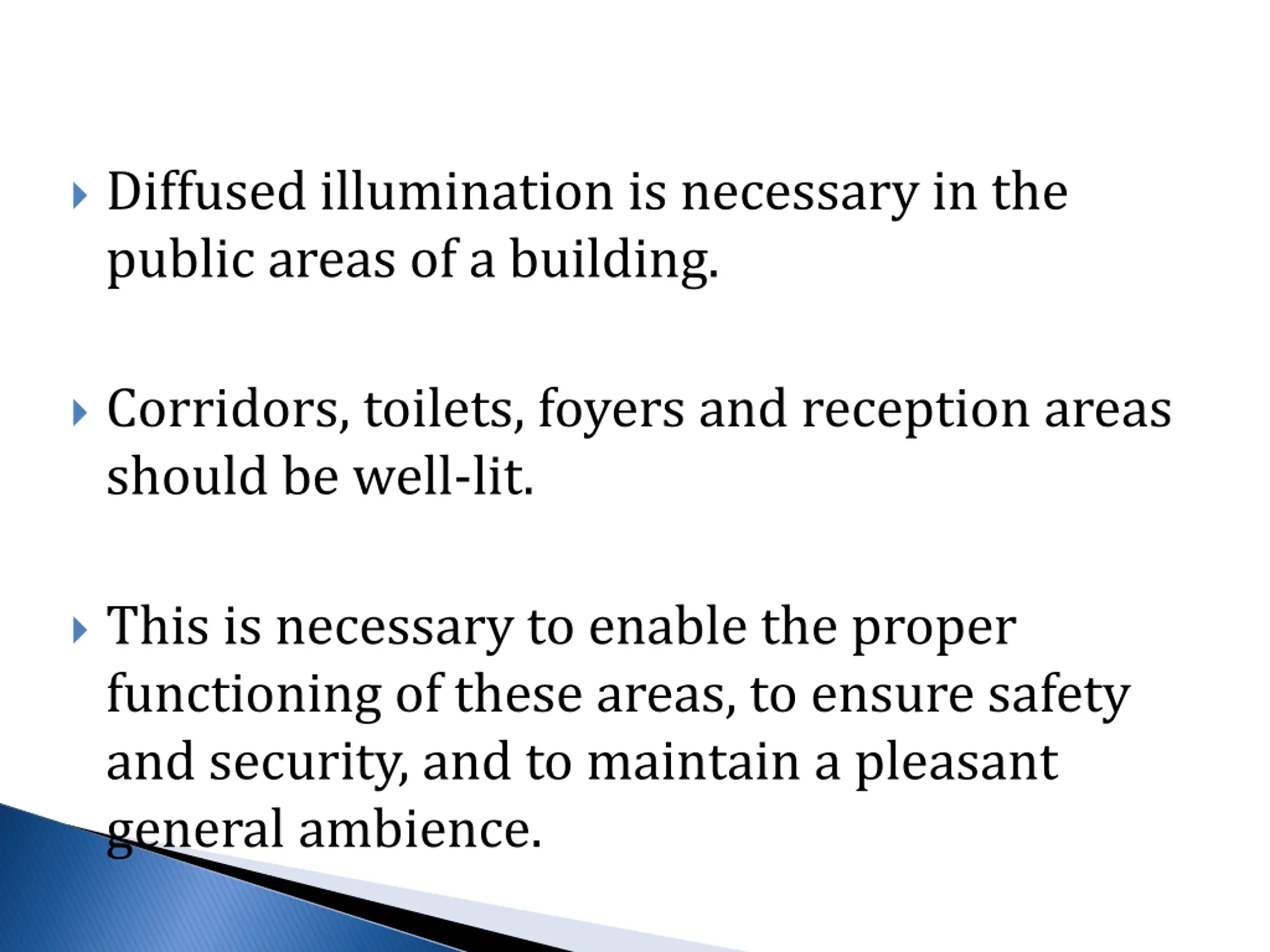 Diffused illumination is necessary in the public areas of a building. Corridors, toilets, foyers and reception areas should be well-lit. This is necessary to enable the proper functioning of these areas, to ensure safety and security, and to maintain a pleasant general ambience.