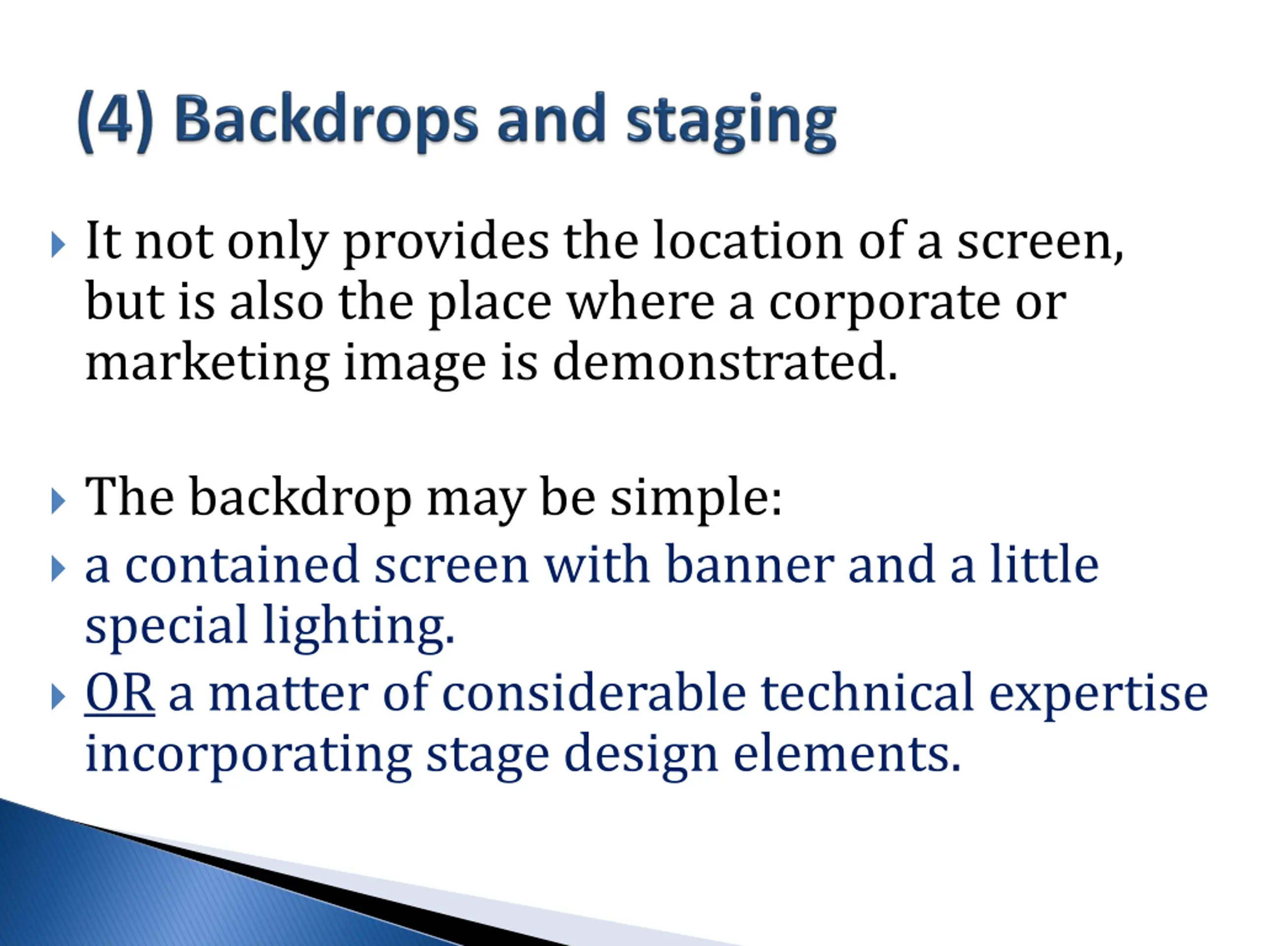 It not only provides the location of a screen, but is also the place where a corporate or marketing image is demonstrated. The backdrop may be simple: a contained screen with banner and a little special lighting. OR a matter of considerable technical expertise incorporating stage design elements.