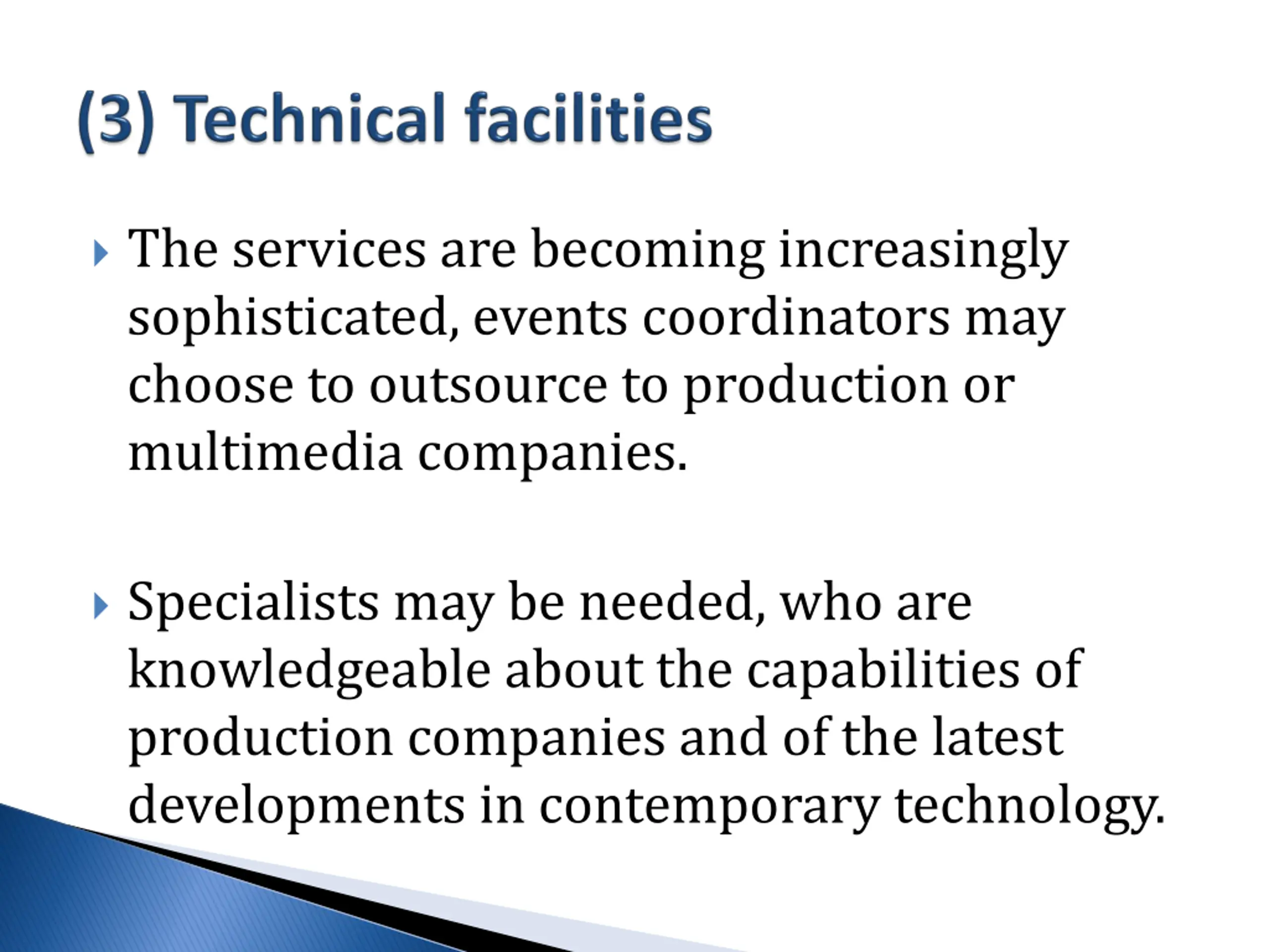 The services are becoming increasingly sophisticated, events coordinators may choose to outsource to production or multimedia companies. Specialists may be needed, who are knowledgeable about the capabilities of production companies and of the latest developments in contemporary technology.