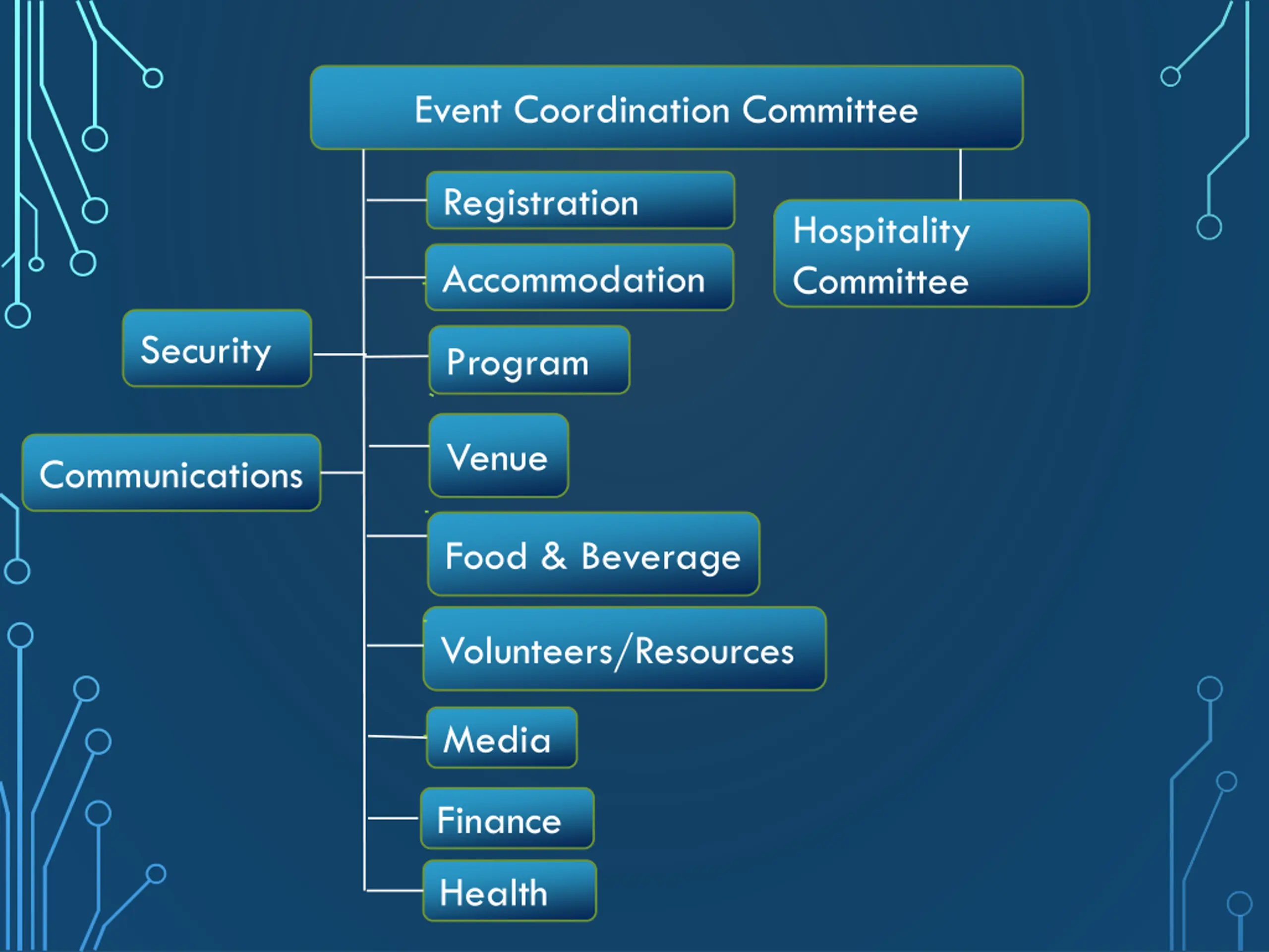 Event Coordination Committee Registration Hospitality Committee Accommodation Security Program Venue Communications Food & Beverage Volunteers/Resources Media Finance Health