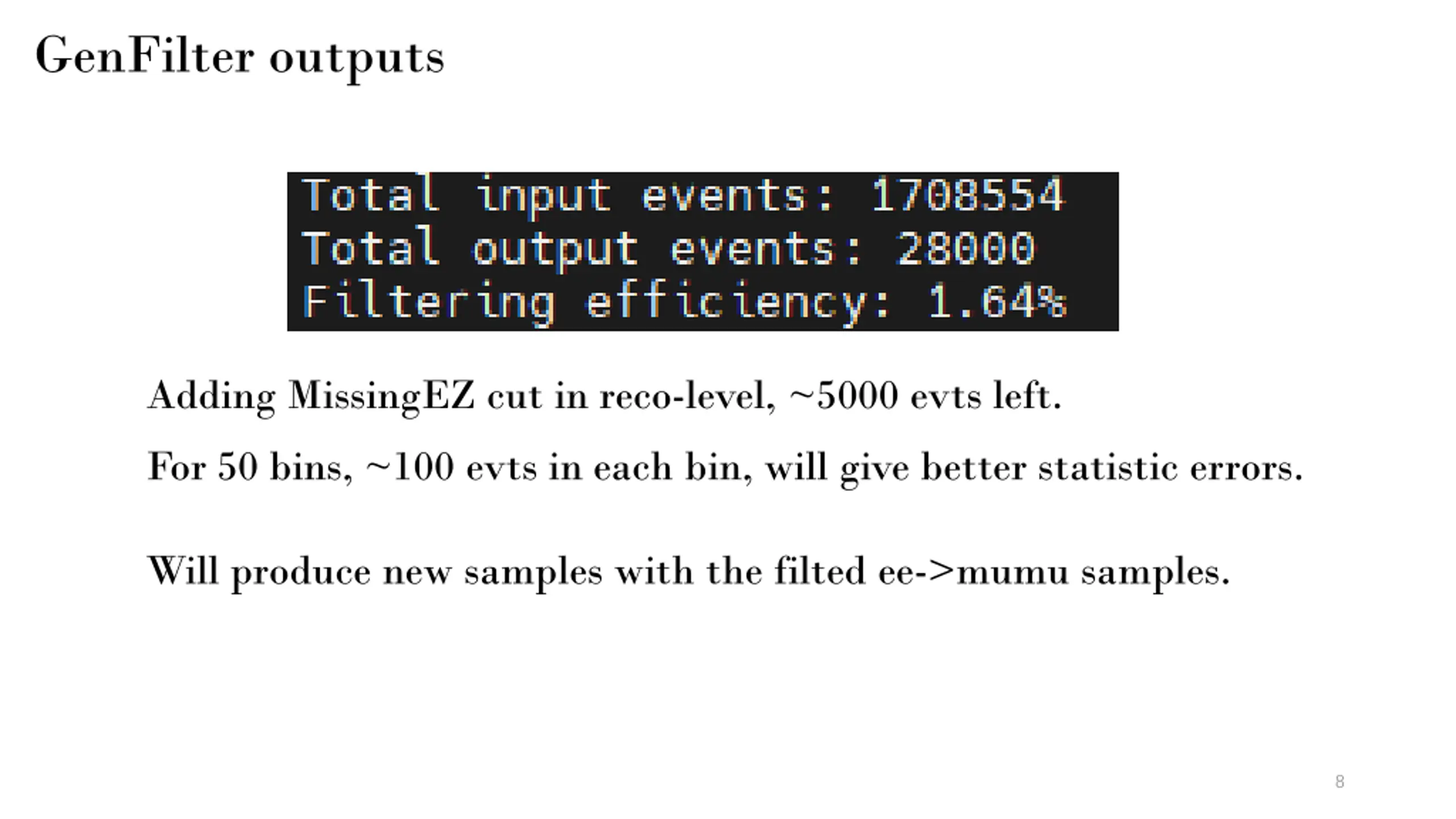 GenFilter outputs Adding MissingEZ cut in reco-level, ~5000 evts left. For 50 bins, ~100 evts in each bin, will give better statistic errors. Will produce new samples with the filted ee->mumu samples. 8
