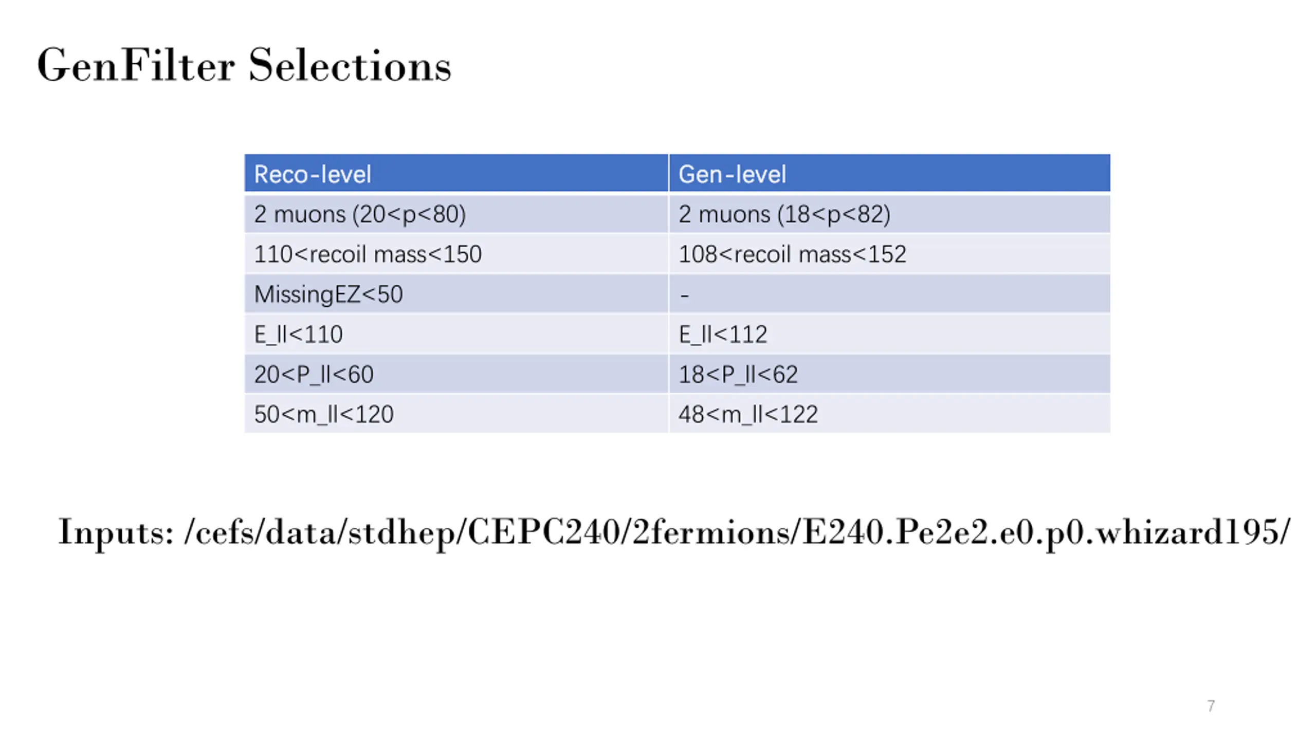 GenFilter Selections Reco Reco- -level level Gen Gen- -level level 2 muons (20<p<80) 2 muons (18<p<82) 110<recoil mass<150 108<recoil mass<152 MissingEZ<50 - E_ll<110 E_ll<112 20<P_ll<60 18<P_ll<62 50<m_ll<120 48<m_ll<122 Inputs: /cefs/data/stdhep/CEPC240/2fermions/E240.Pe2e2.e0.p0.whizard195/ 7