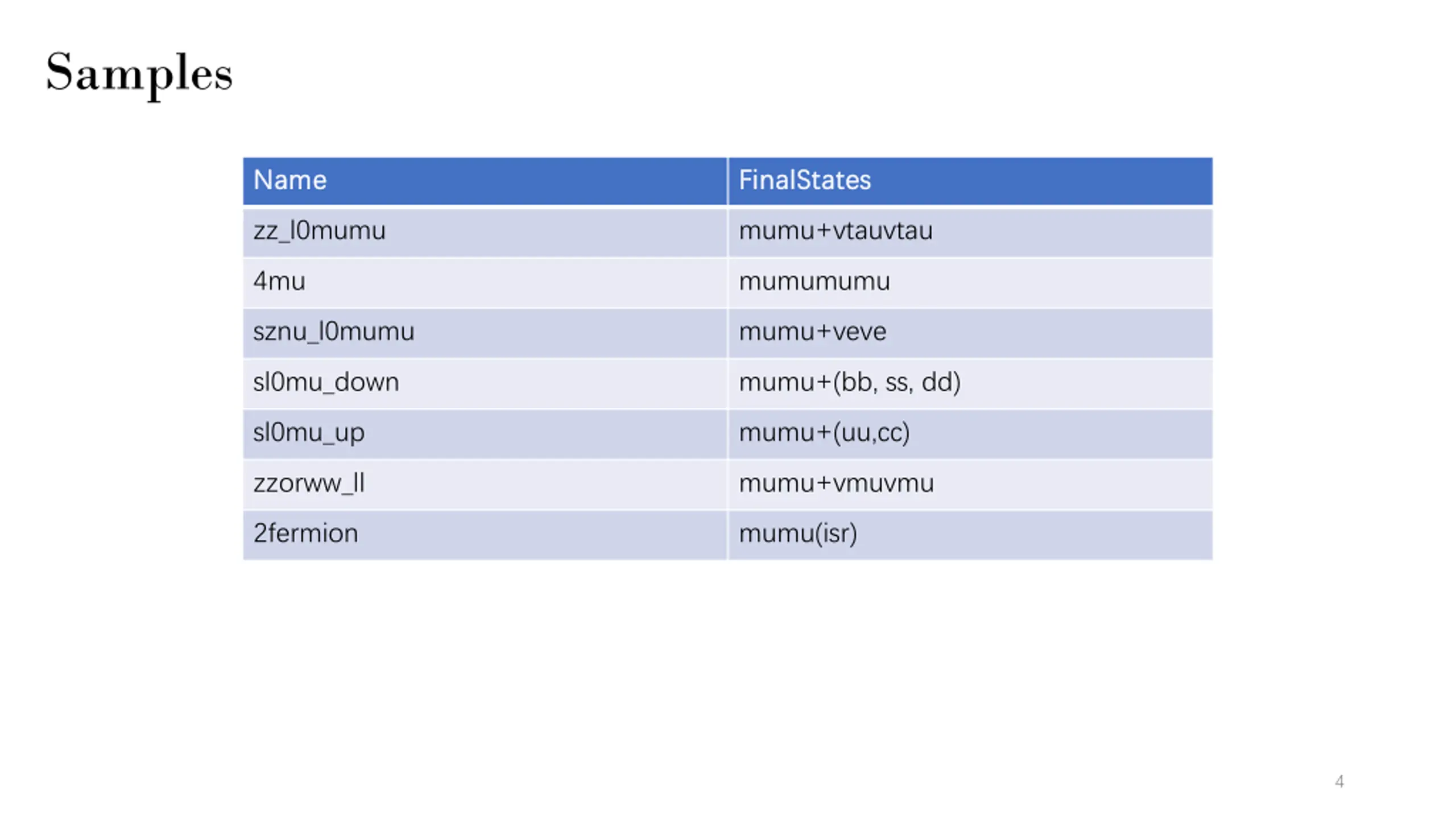 Samples Name Name FinalStates FinalStates zz_l0mumu mumu+vtauvtau 4mu mumumumu sznu_l0mumu mumu+veve sl0mu_down mumu+(bb, ss, dd) sl0mu_up mumu+(uu,cc) zzorww_ll mumu+vmuvmu 2fermion mumu(isr) 4