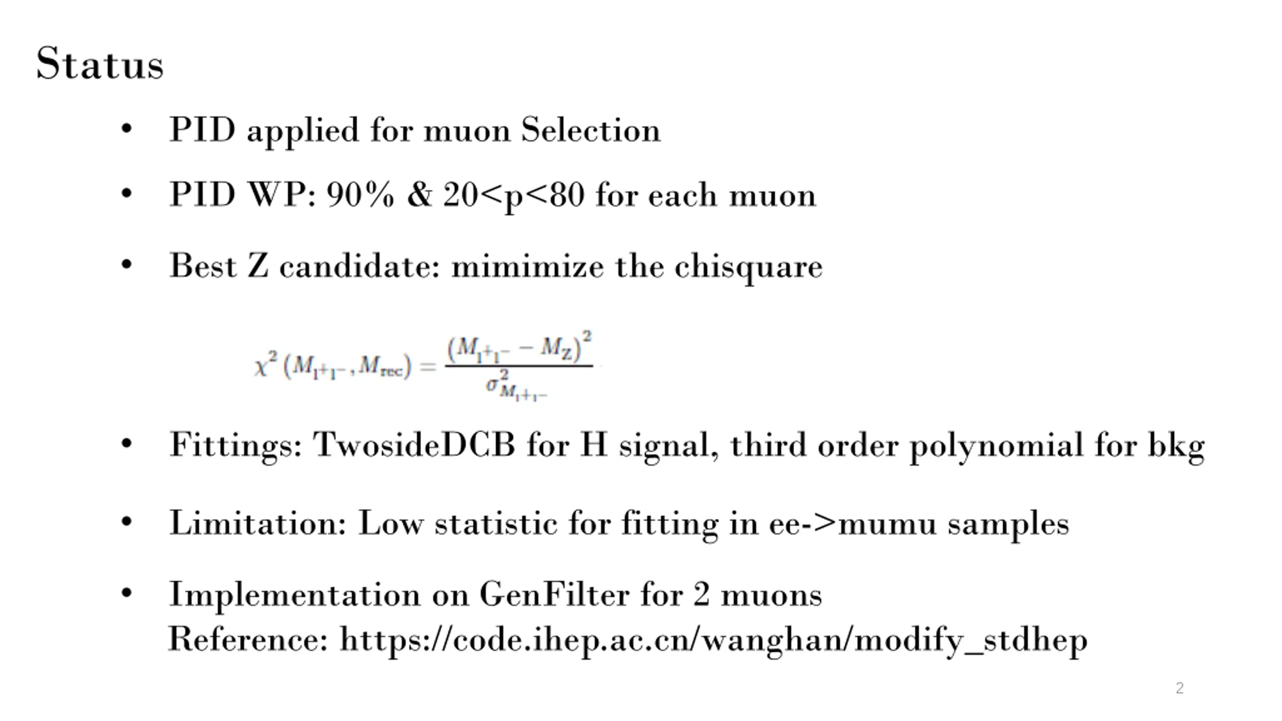 Status PID applied for muon Selection PID WP: 90% & 20<p<80 for each muon Best Z candidate: mimimize the chisquare Fittings: TwosideDCB for H signal, third order polynomial for bkg Limitation: Low statistic for fitting in ee->mumu samples Implementation on GenFilter for 2 muons Reference: https://code.ihep.ac.cn/wanghan/modify_stdhep 2