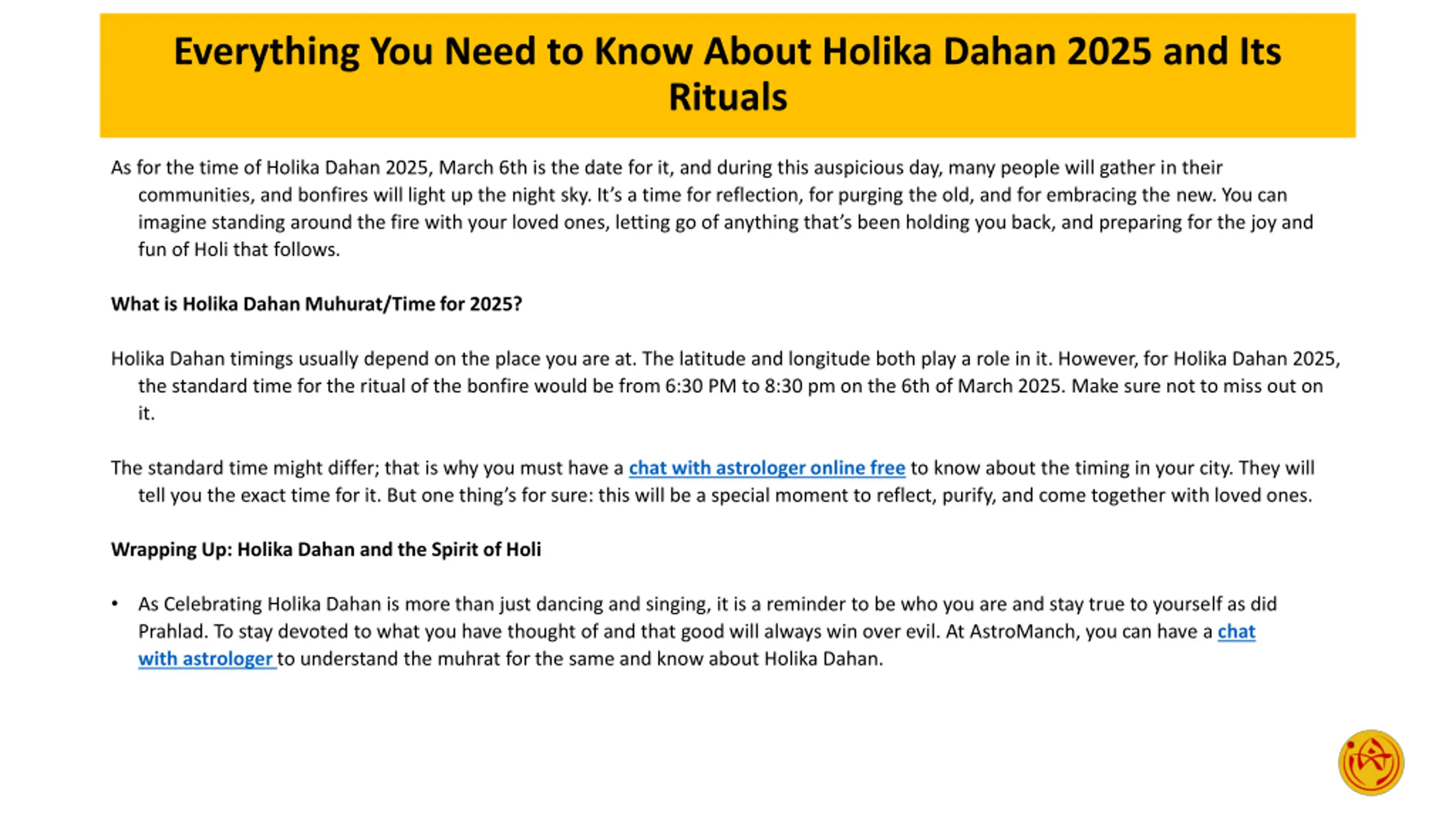 Everything You Need to Know About Holika Dahan 2025 and Its Rituals As for the time of Holika Dahan 2025, March 6th is the date for it, and during this auspicious day, many people will gather in their communities, and bonfires will light up the night sky. It s a time for reflection, for purging the old, and for embracing the new. You can imagine standing around the fire with your loved ones, letting go of anything that s been holding you back, and preparing for the joy and fun of Holi that follows. What is Holika Dahan Muhurat/Time for 2025? Holika Dahan timings usually depend on the place you are at. The latitude and longitude both play a role in it. However, for Holika Dahan 2025, the standard time for the ritual of the bonfire would be from 6:30 PM to 8:30 pm on the 6th of March 2025. Make sure not to miss out on it. The standard time might differ; that is why you must have a chat with astrologer online free to know about the timing in your city. They will tell you the exact time for it. But one thing s for sure: this will be a special moment to reflect, purify, and come together with loved ones. Wrapping Up: Holika Dahan and the Spirit of Holi As Celebrating Holika Dahan is more than just dancing and singing, it is a reminder to be who you are and stay true to yourself as did Prahlad. To stay devoted to what you have thought of and that good will always win over evil. At AstroManch, you can have a chat with astrologer to understand the muhrat for the same and know about Holika Dahan.