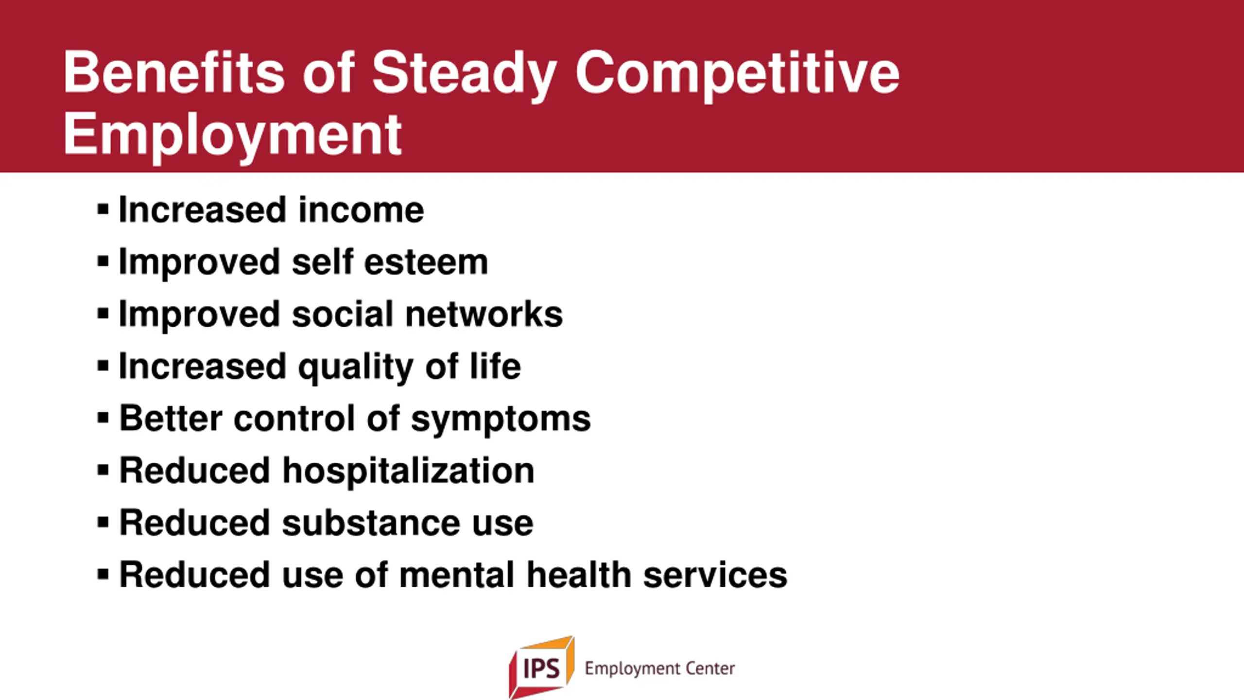 Benefits of Steady Competitive Employment Increased income Improved self esteem Improved social networks Increased quality of life Better control of symptoms Reduced hospitalization Reduced substance use Reduced use of mental health services