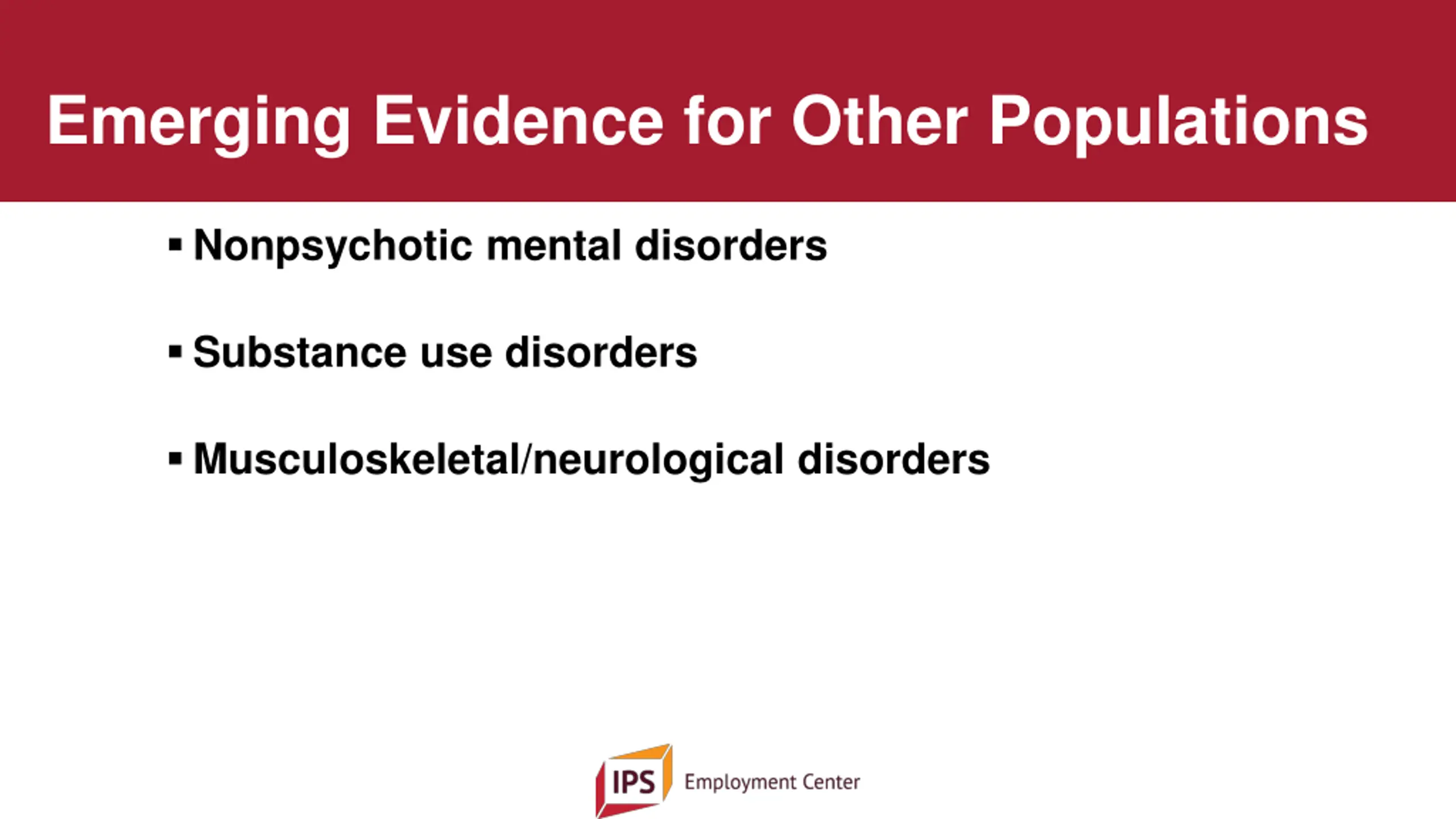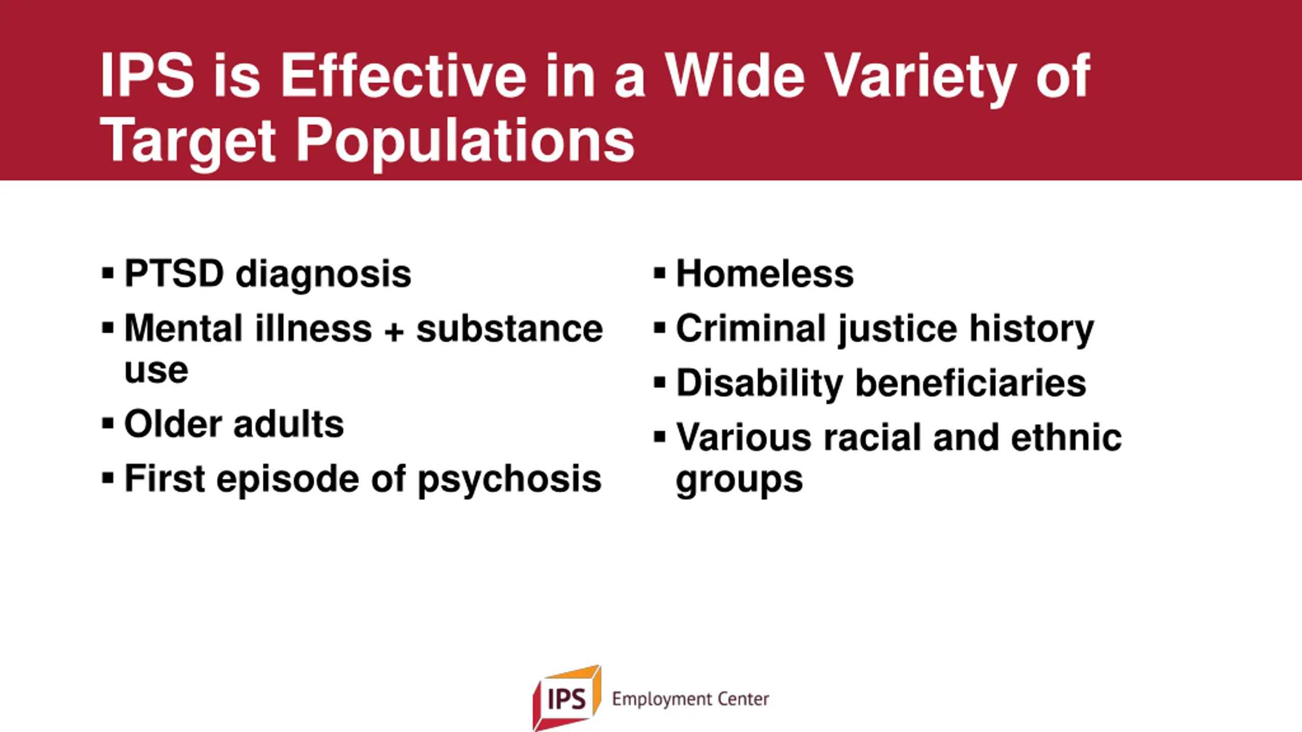 IPS is Effective in a Wide Variety of Target Populations PTSD diagnosis Mental illness + substance use Older adults First episode of psychosis Homeless Criminal justice history Disability beneficiaries Various racial and ethnic groups